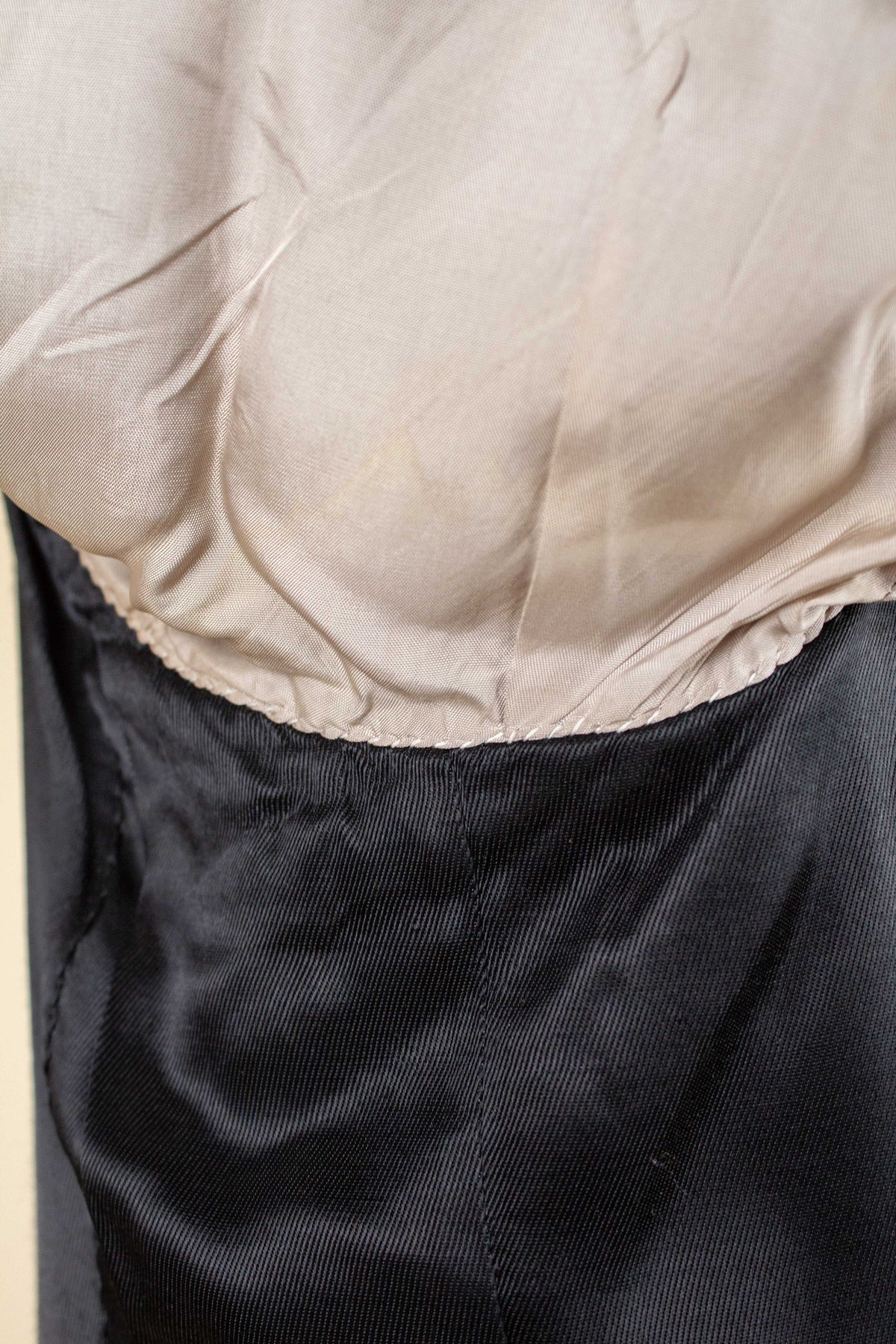 As for the condition, there are a number of points to note. The most prominent defect is a repair to one of the lapels, and there is also some discolouration to the lining, both in the jacket and the trousers. Please study the photographs and form your own opinion regarding the condition.