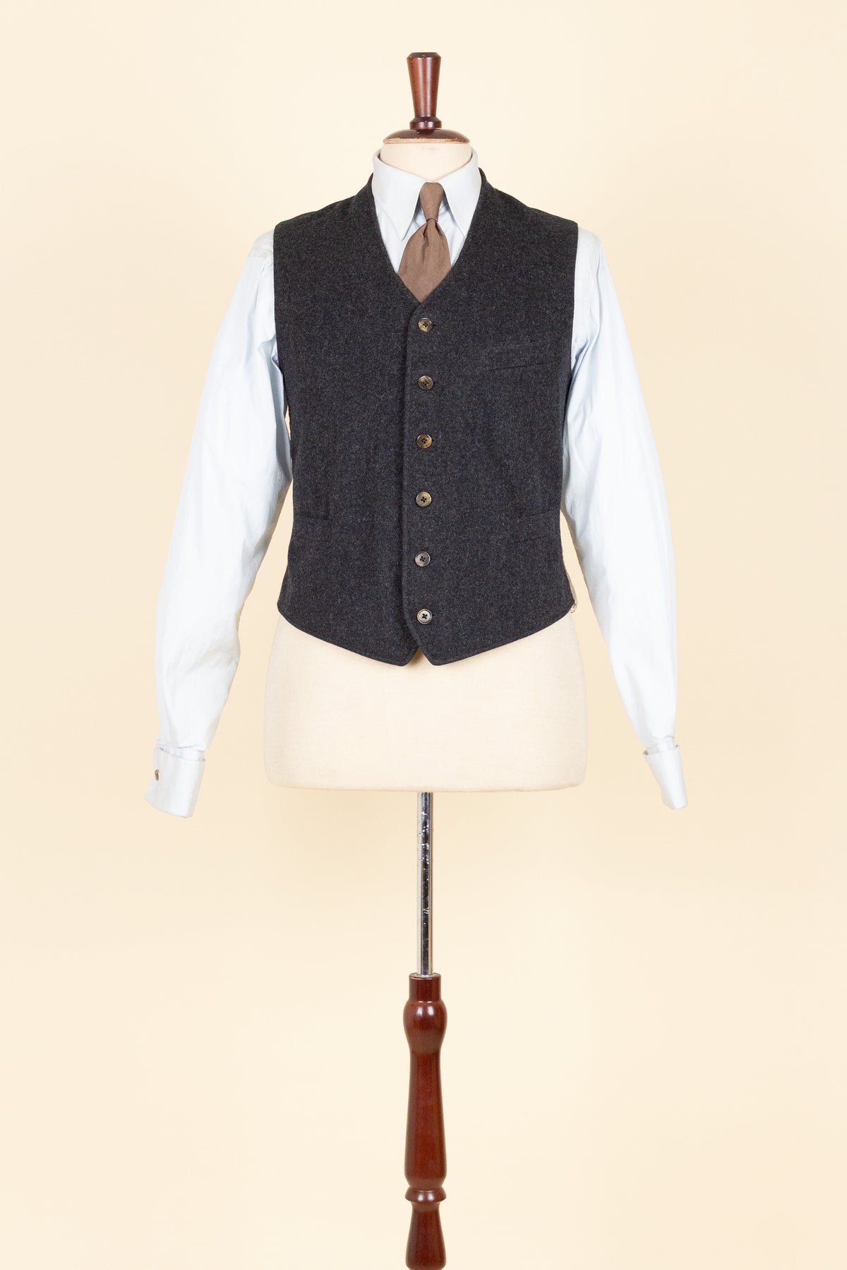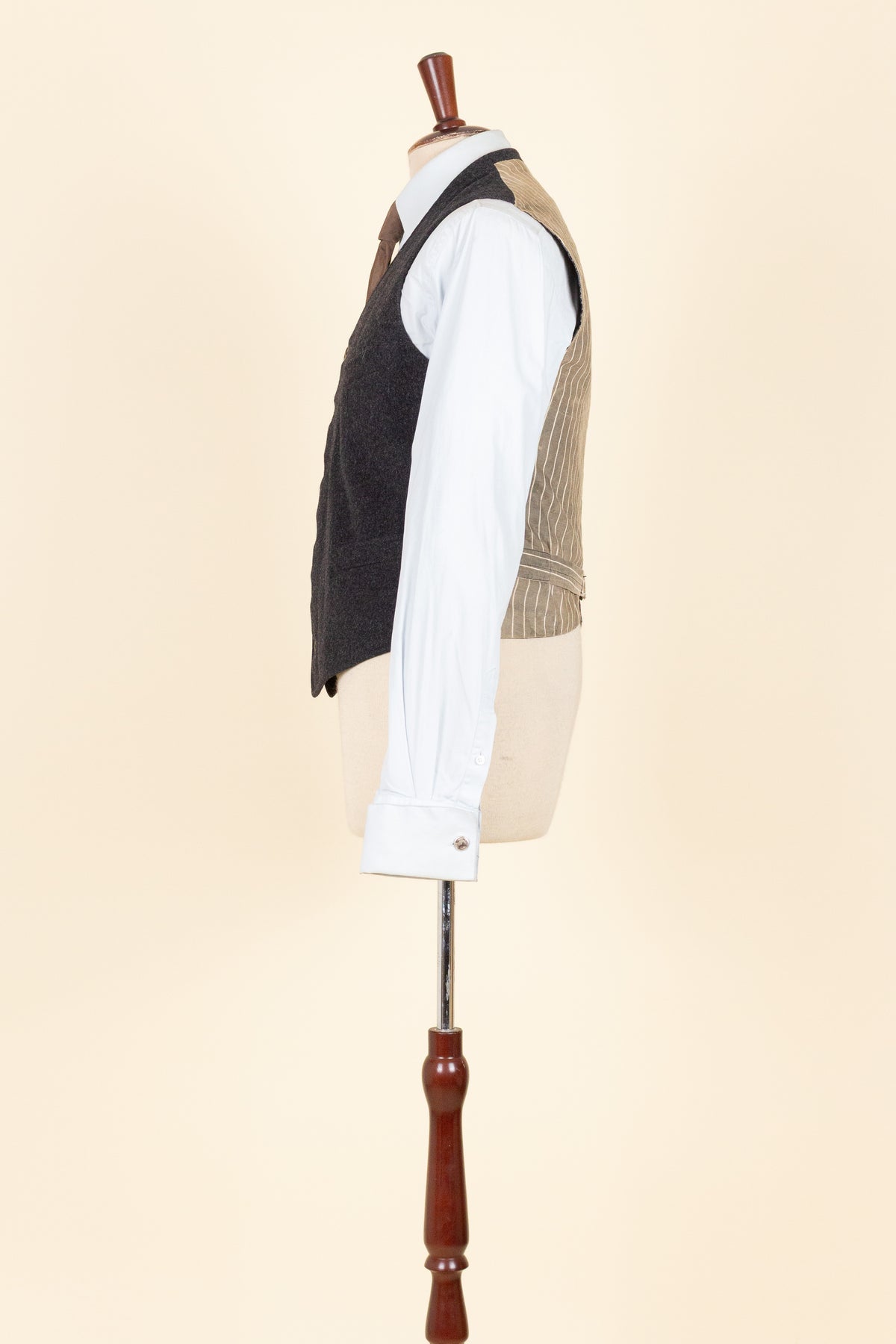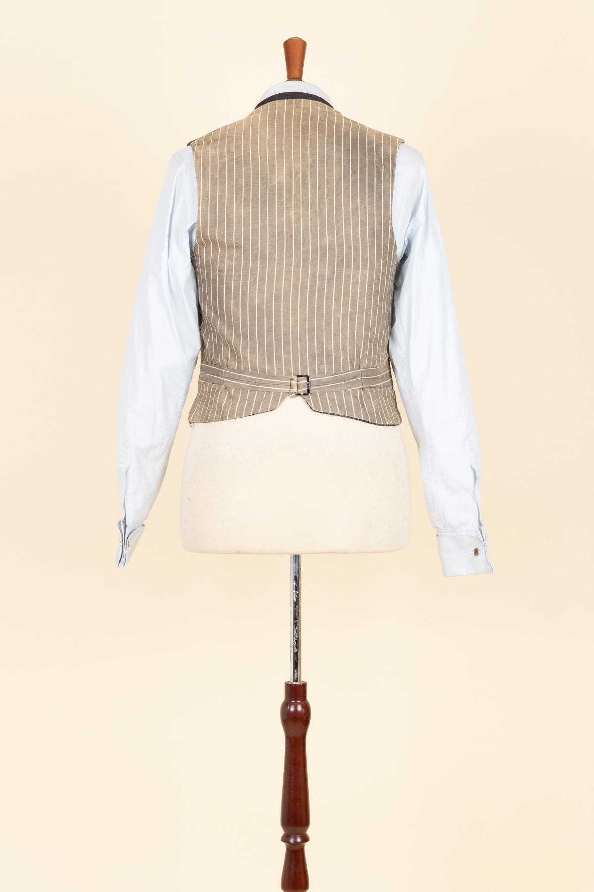 The waistcoat is period-correct in cut, with a high fastening and no darts. It is single-breasted and fastens with six buttons. It has three front pockets: a breast pocket on the left side and a lower pocket on each side. The back is made from a striped cotton fabric and includes an adjustable back strap to regulate the fit.
