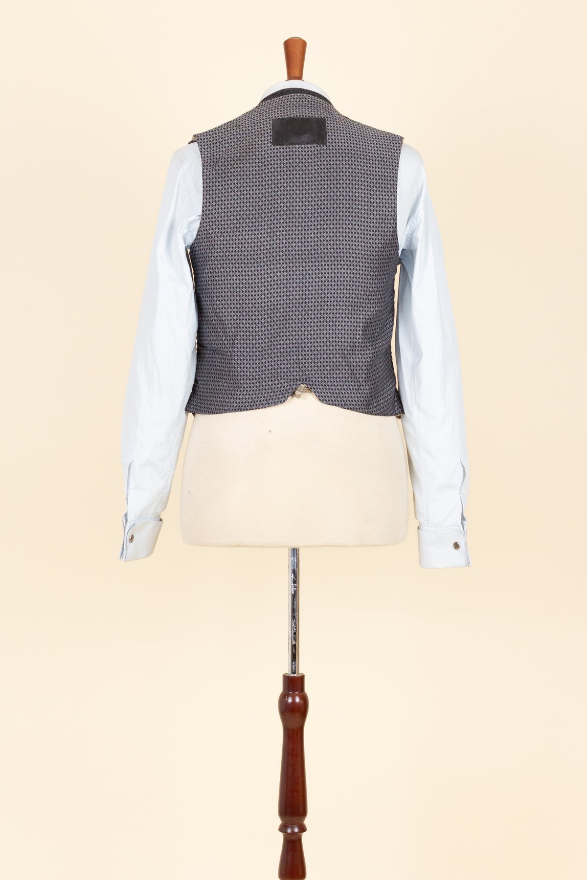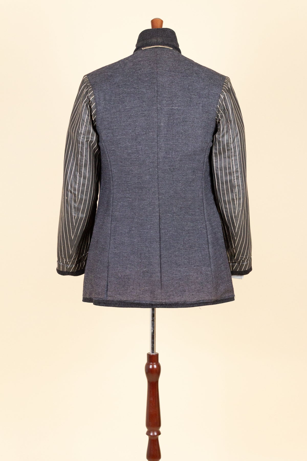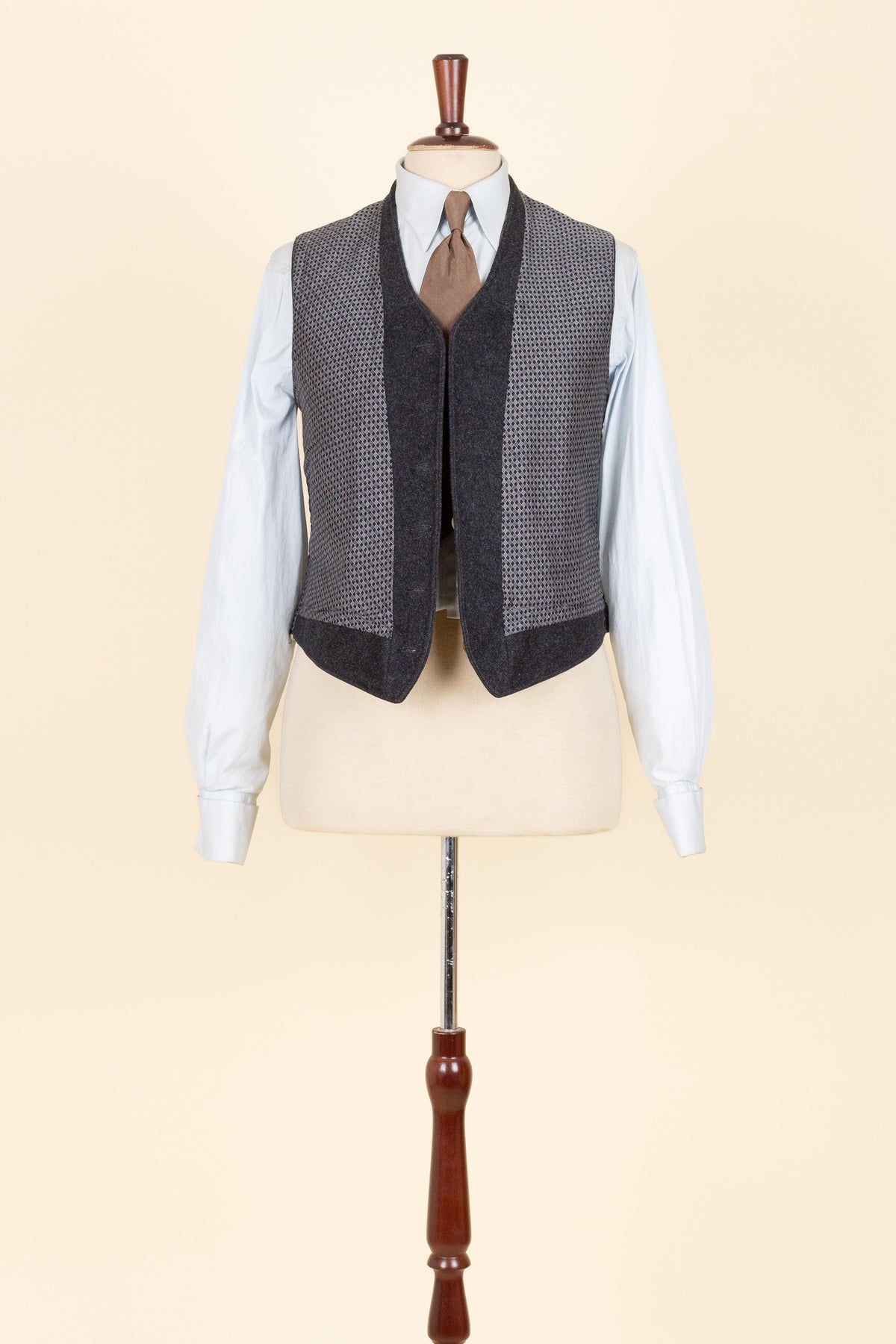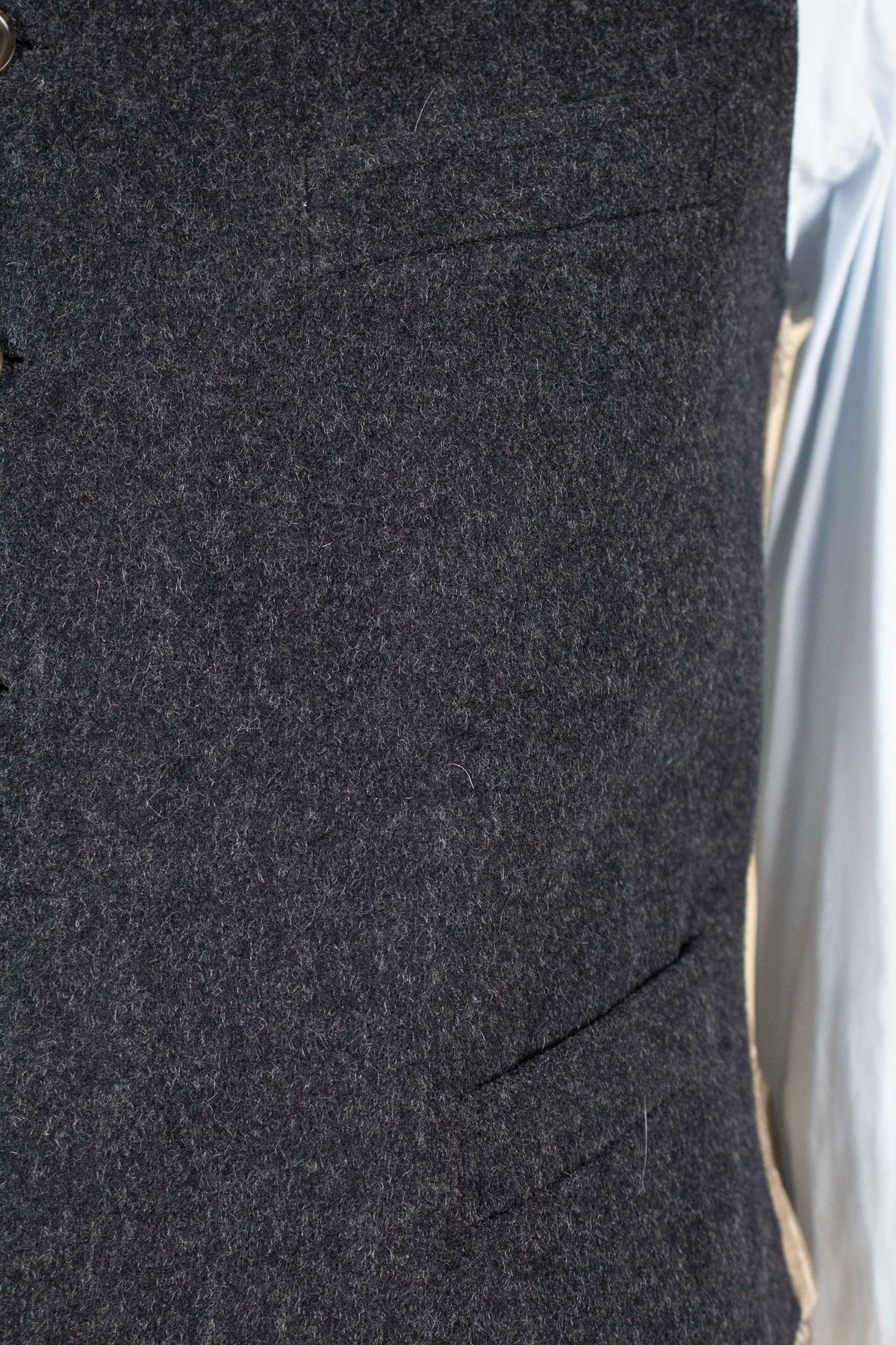 The waistcoat is period-correct in cut, with a high fastening and no darts. It is single-breasted and fastens with six buttons. It has three front pockets: a breast pocket on the left side and a lower pocket on each side. The back is made from a striped cotton fabric and includes an adjustable back strap to regulate the fit.