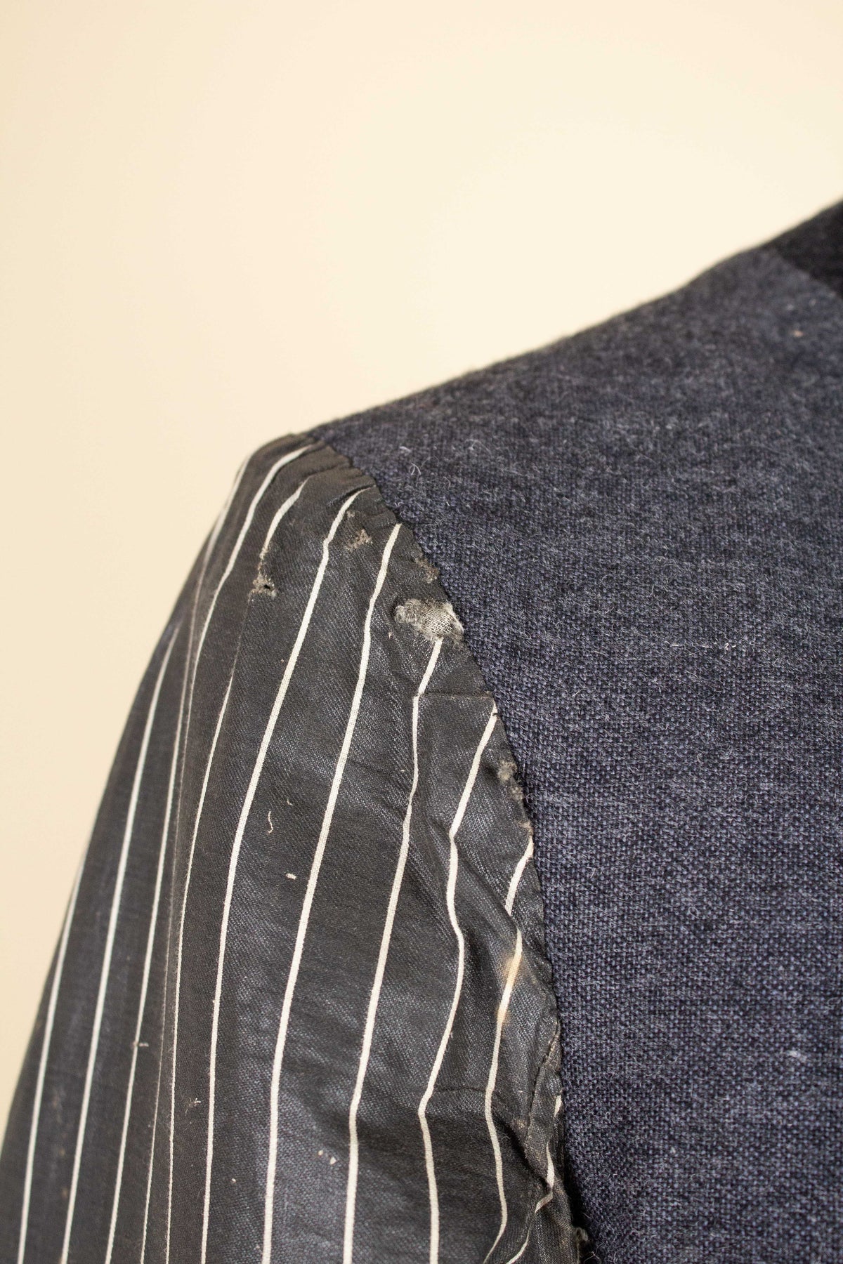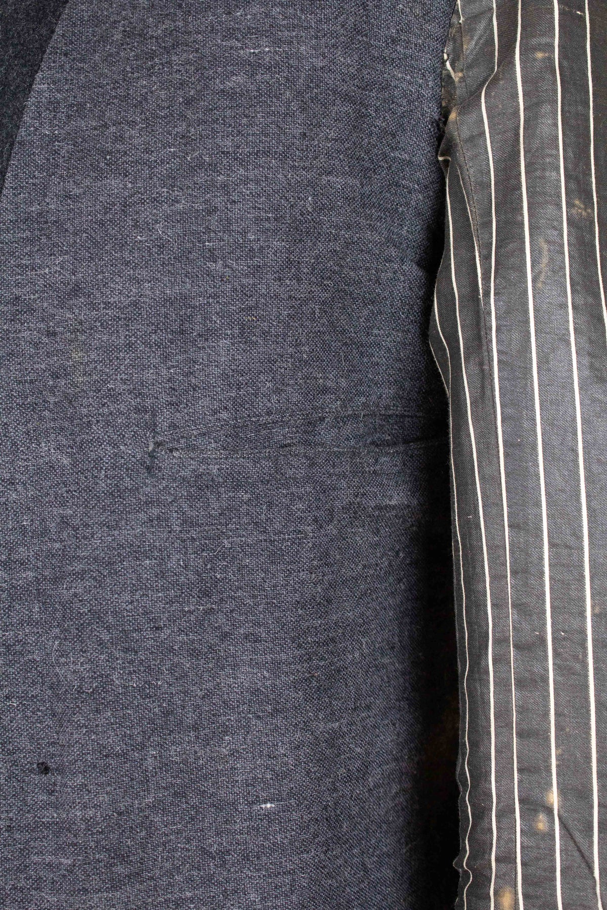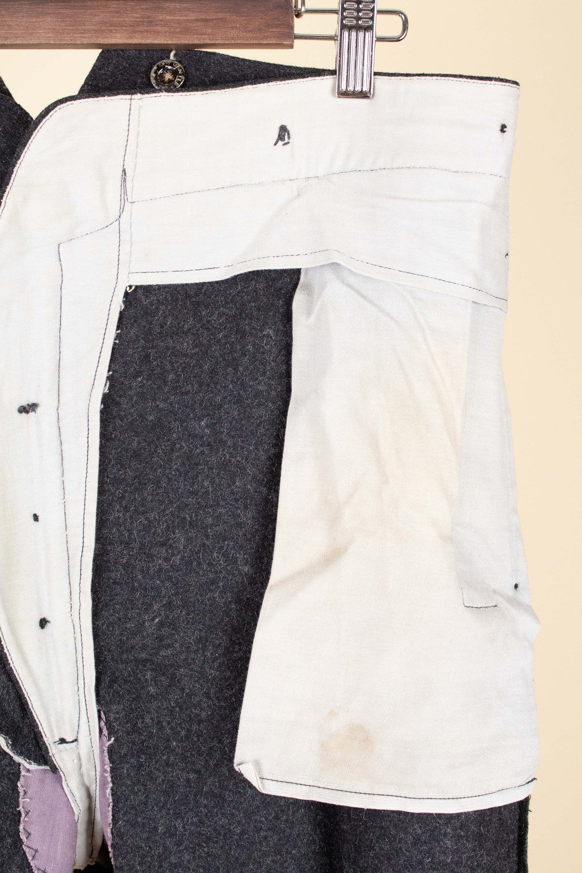 Regarding condition, it is overall excellent considering the suit’s age and character. This does not mean that it is entirely free from flaws. Most notably, there are minor damages and discolourations to the linings across all three pieces. There is a repair to the waistcoat lining on the inside, in the form of a black patch. None of the issues mentioned are visible when the suit is worn. One of the buttons on the left jacket cuff is damaged. Some of the brace buttons are mismatched. Please study the images carefully and form your own assessment of the condition.