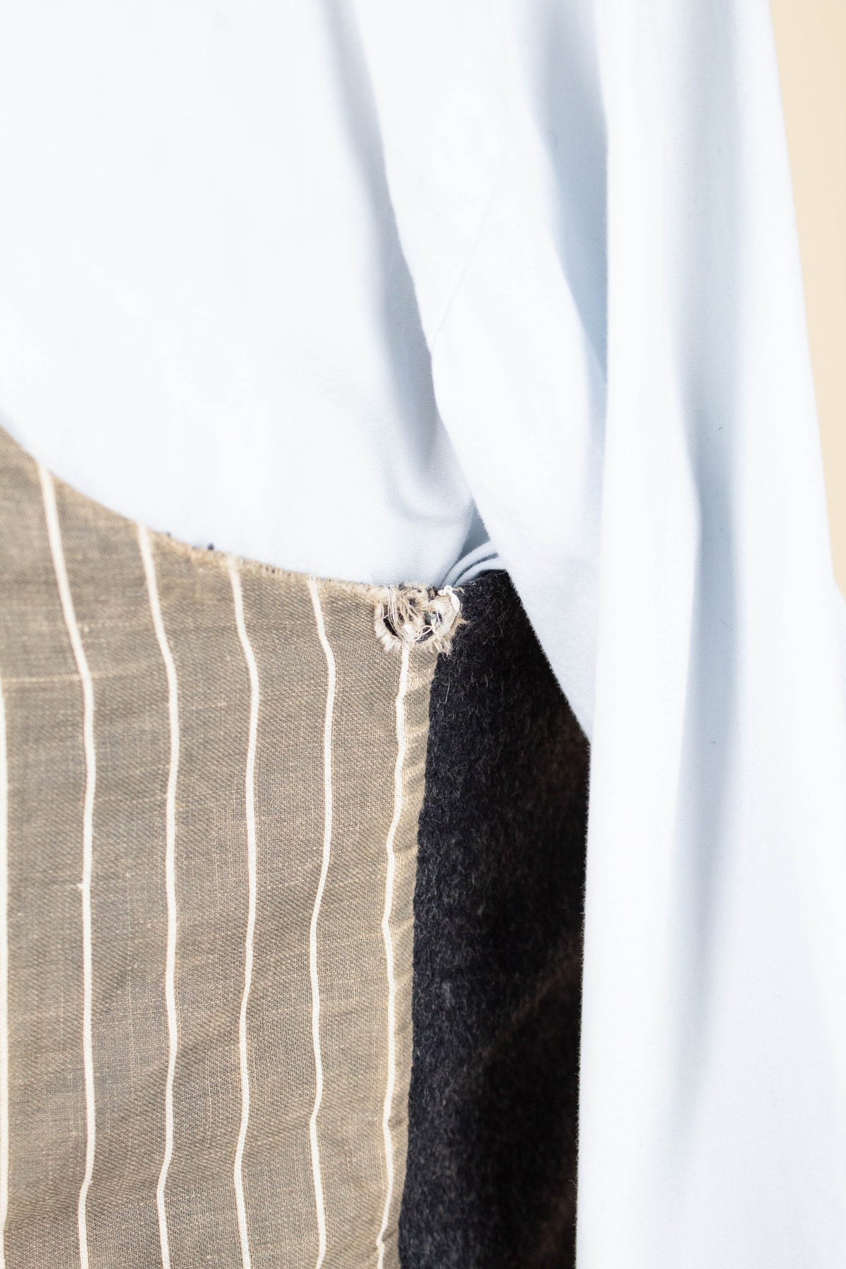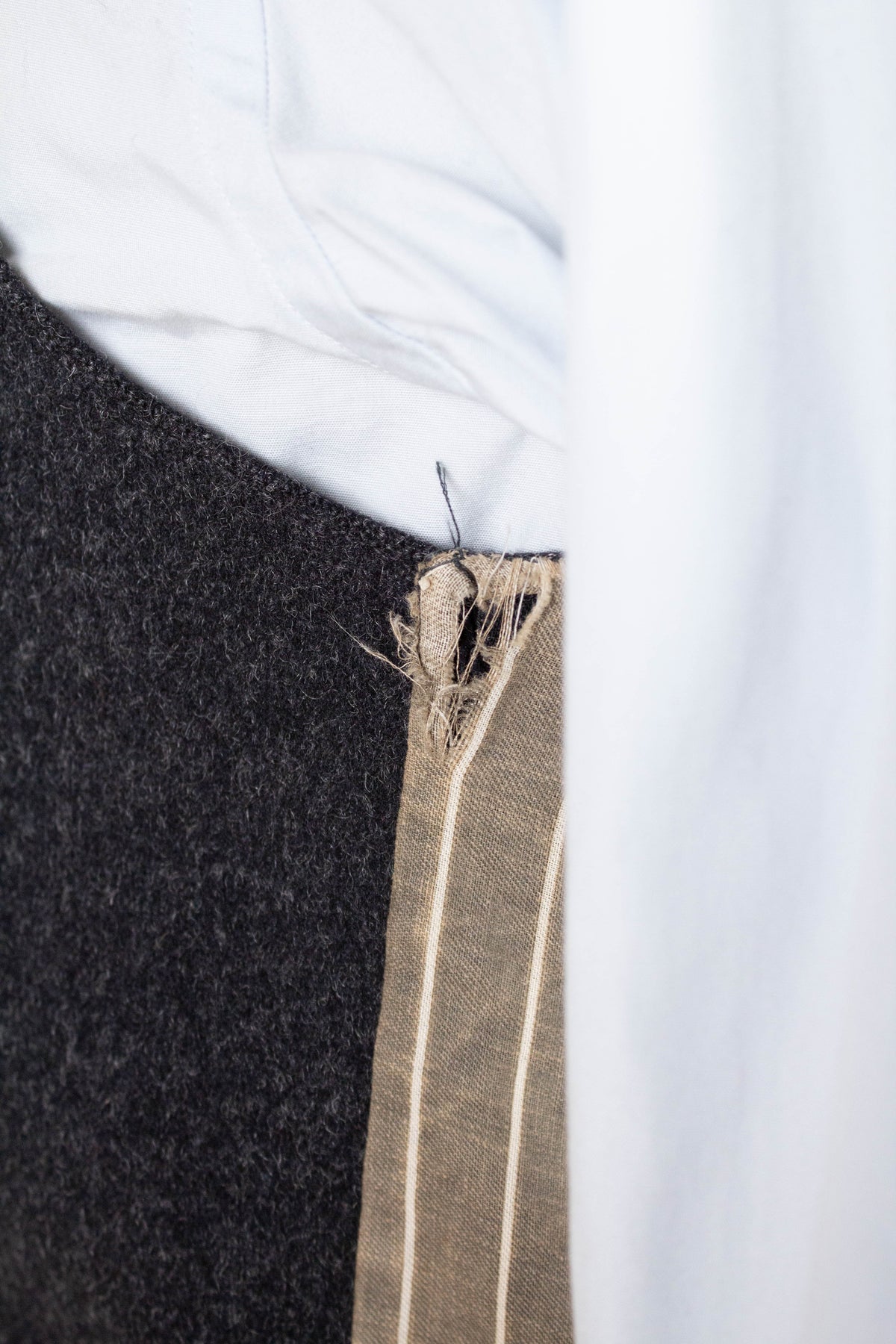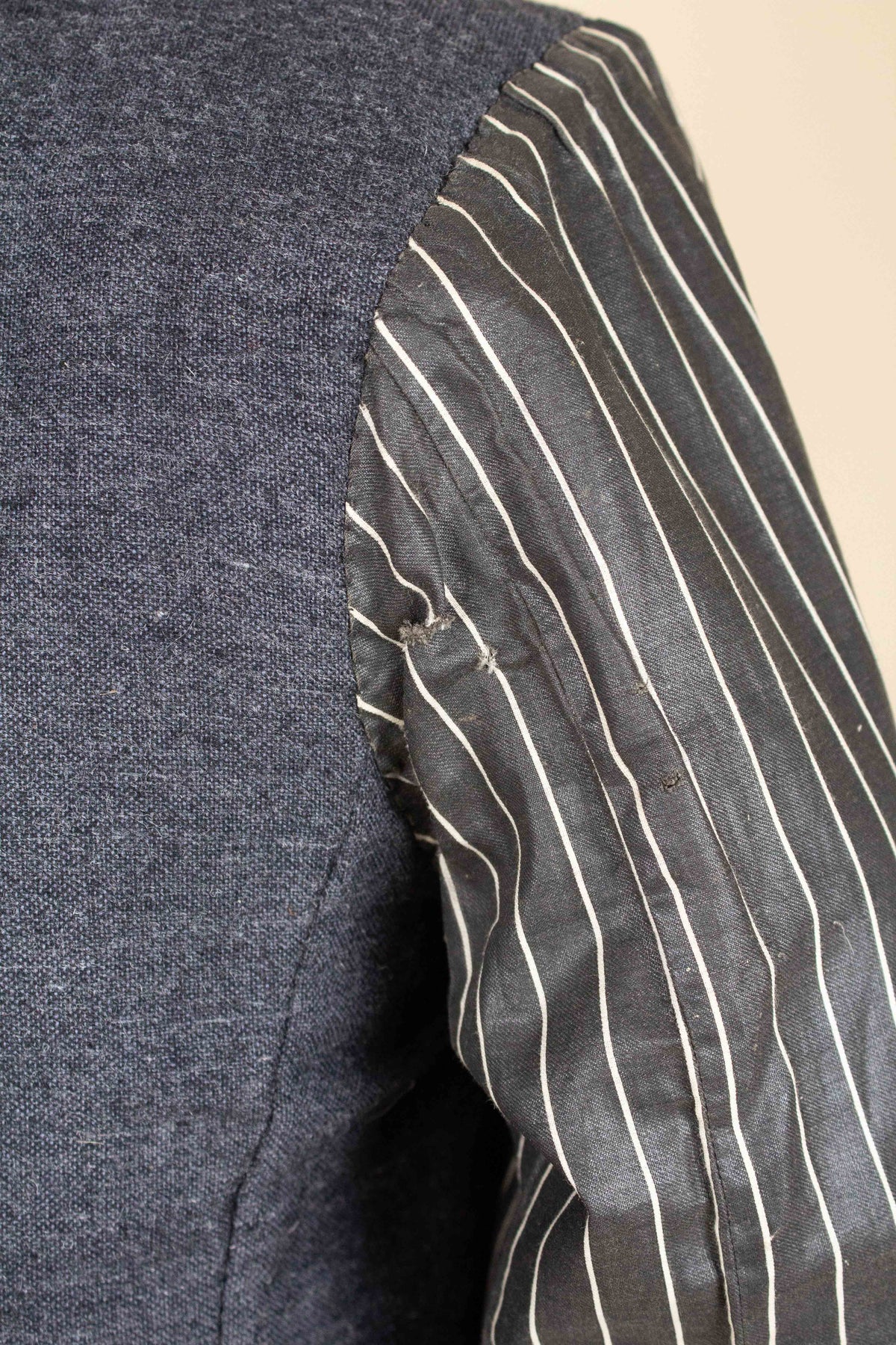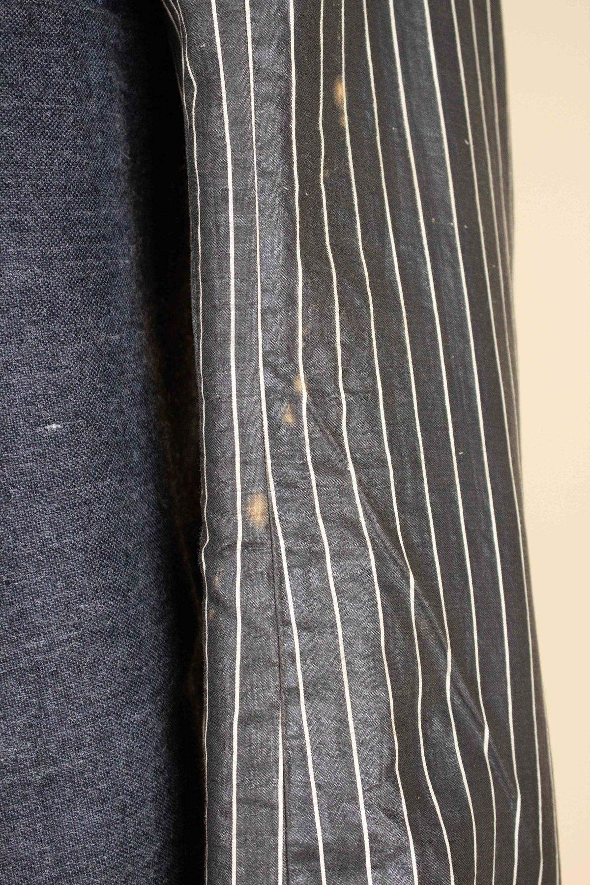 Regarding condition, it is overall excellent considering the suit’s age and character. This does not mean that it is entirely free from flaws. Most notably, there are minor damages and discolourations to the linings across all three pieces. There is a repair to the waistcoat lining on the inside, in the form of a black patch. None of the issues mentioned are visible when the suit is worn. One of the buttons on the left jacket cuff is damaged. Some of the brace buttons are mismatched. Please study the images carefully and form your own assessment of the condition.