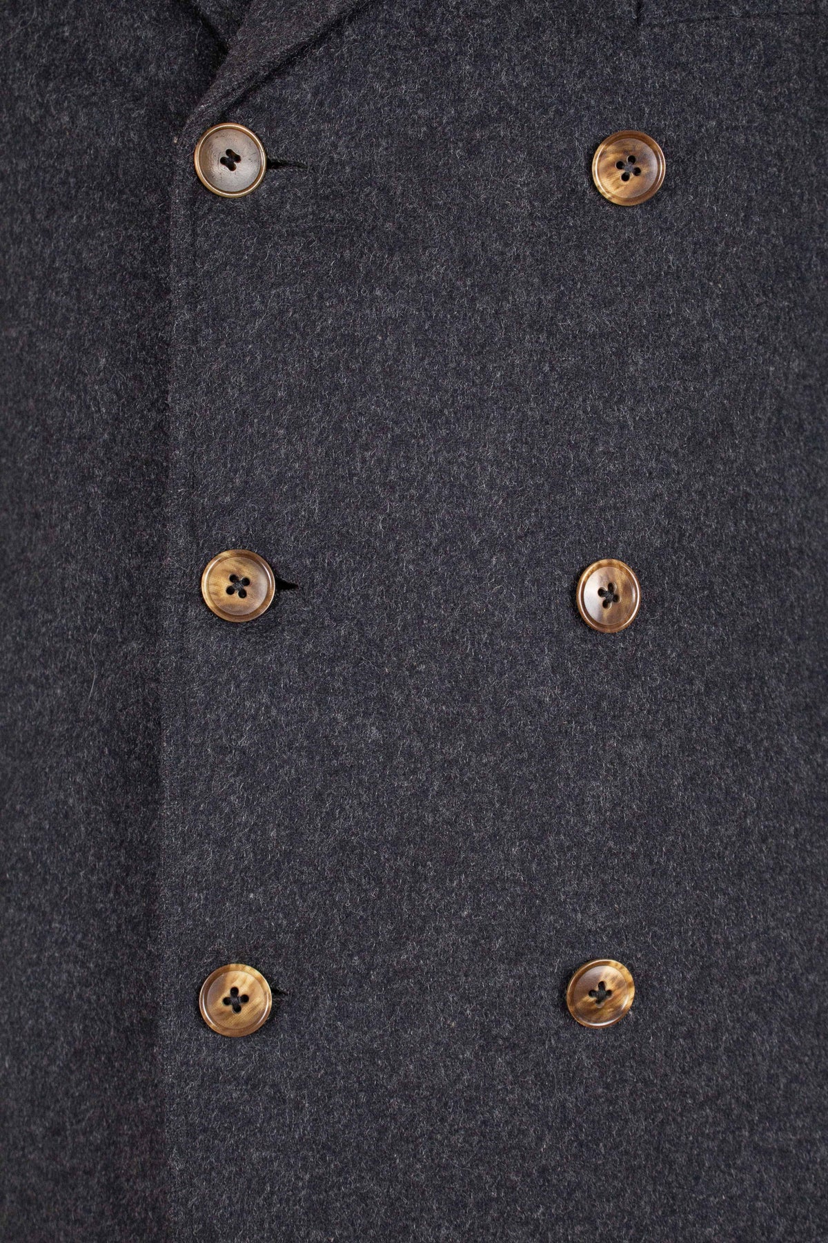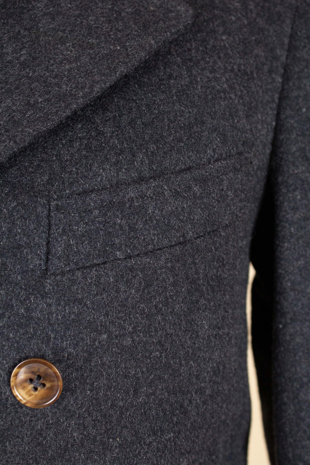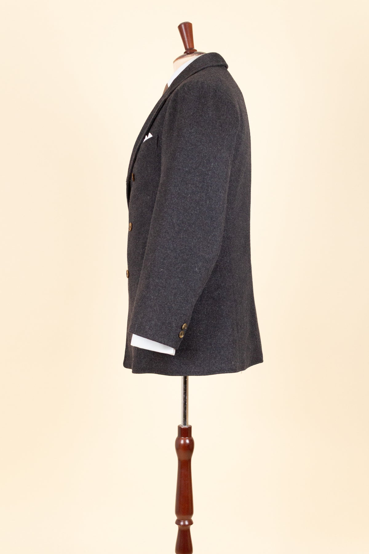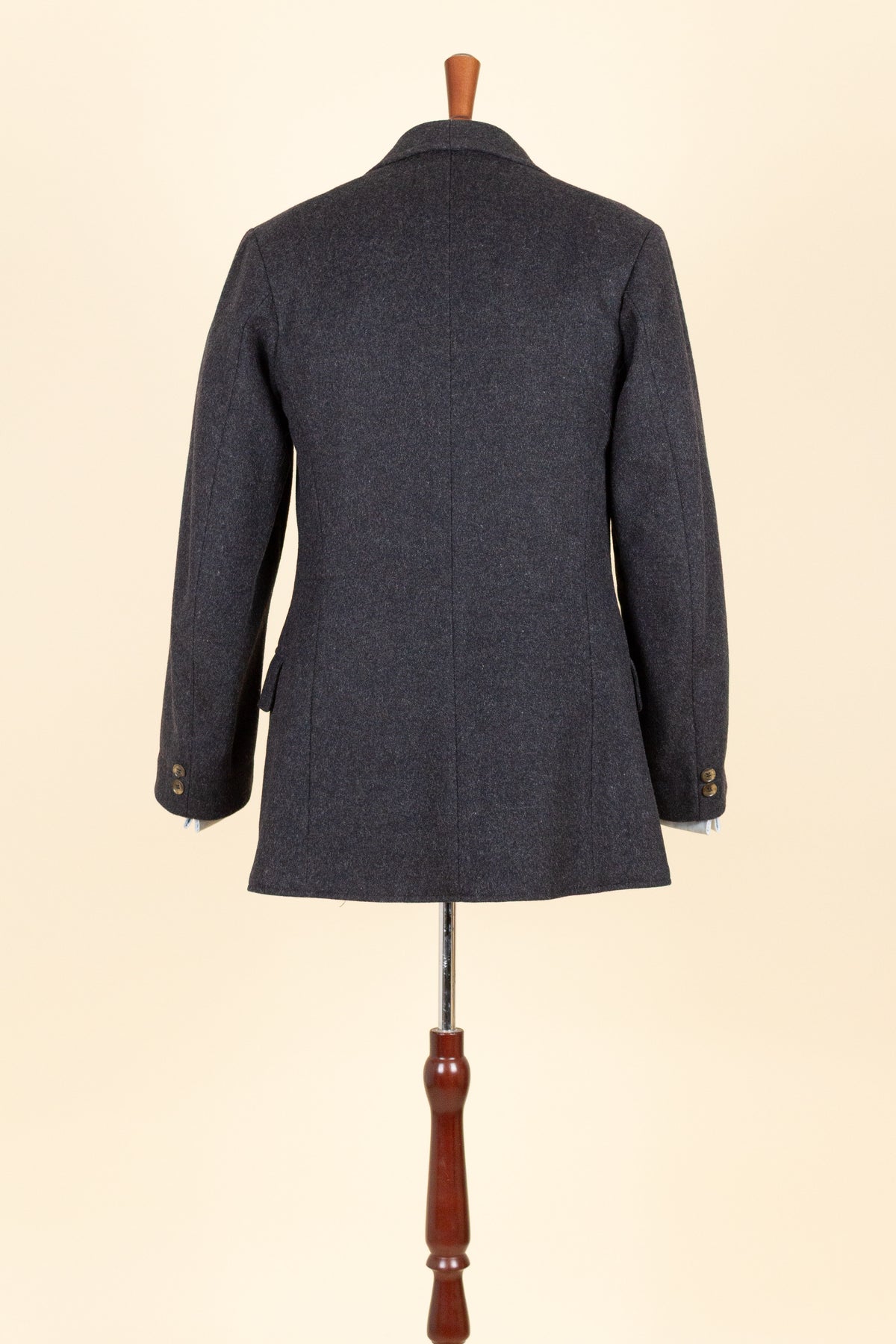 The jacket is double-breasted with contrasting brown buttons and features three rows of buttons, all of which are functional. It has horizontal front pockets with flaps as well as a breast pocket. The back is straight and lacks vents. The sleeves feature two buttons at the cuffs. Internally, the jacket is fully lined in a grey-mottled wool fabric throughout the body and includes an inner pocket on the right-hand side.