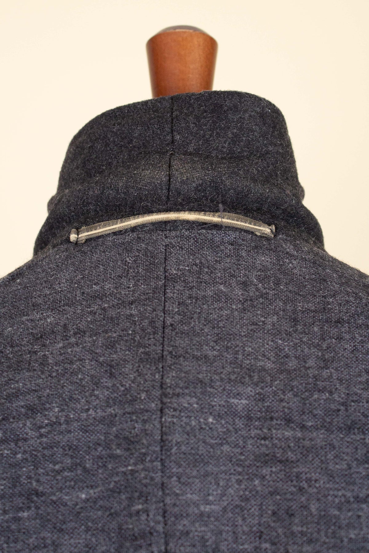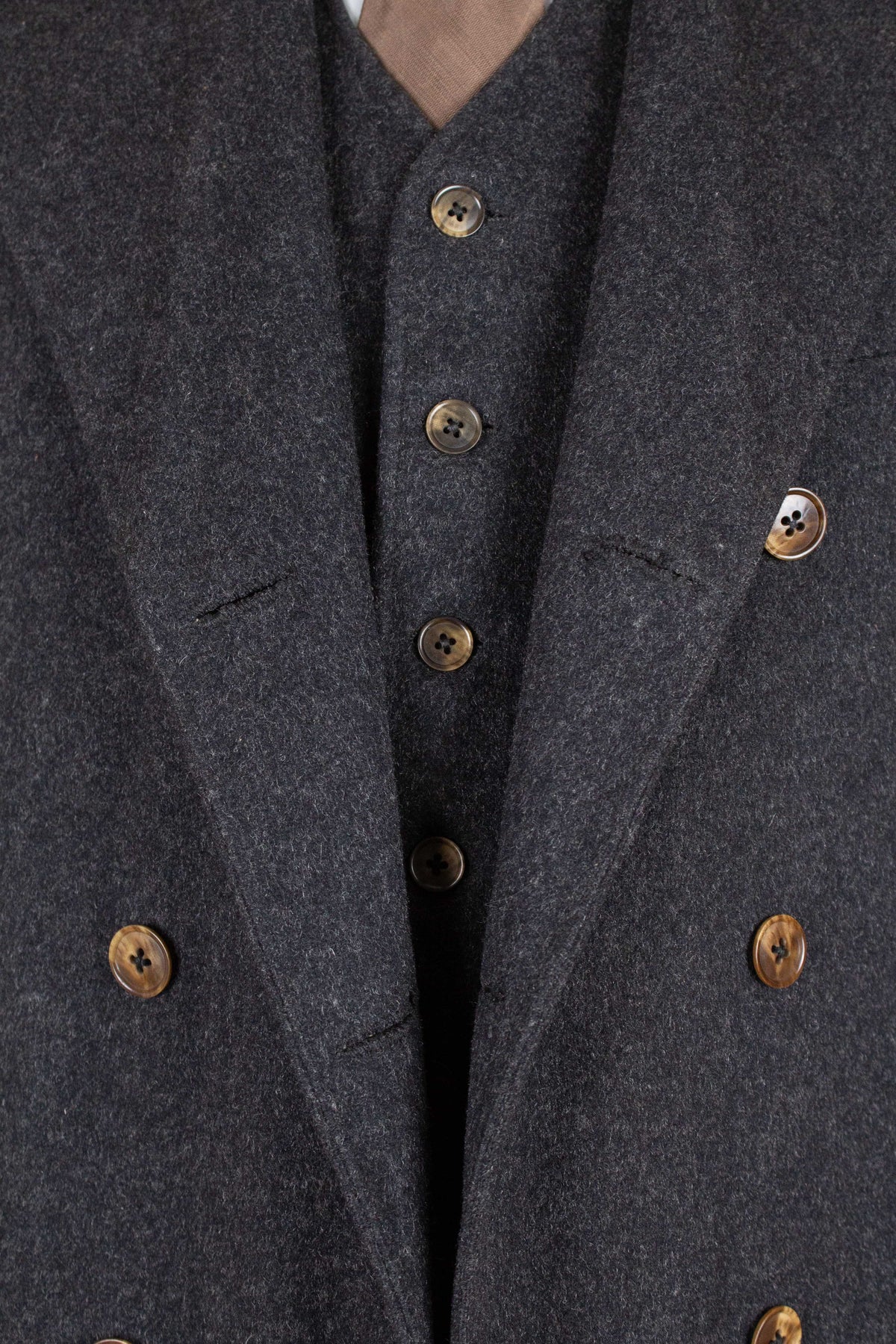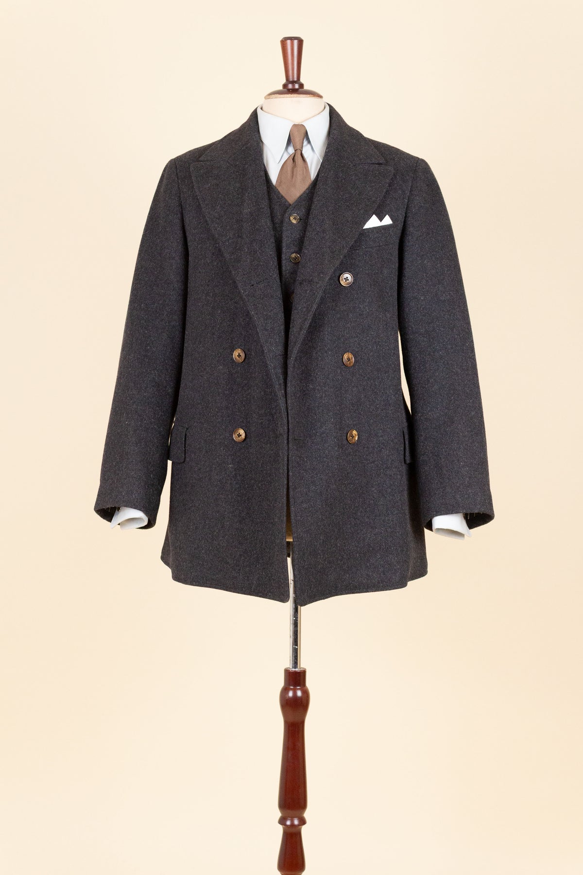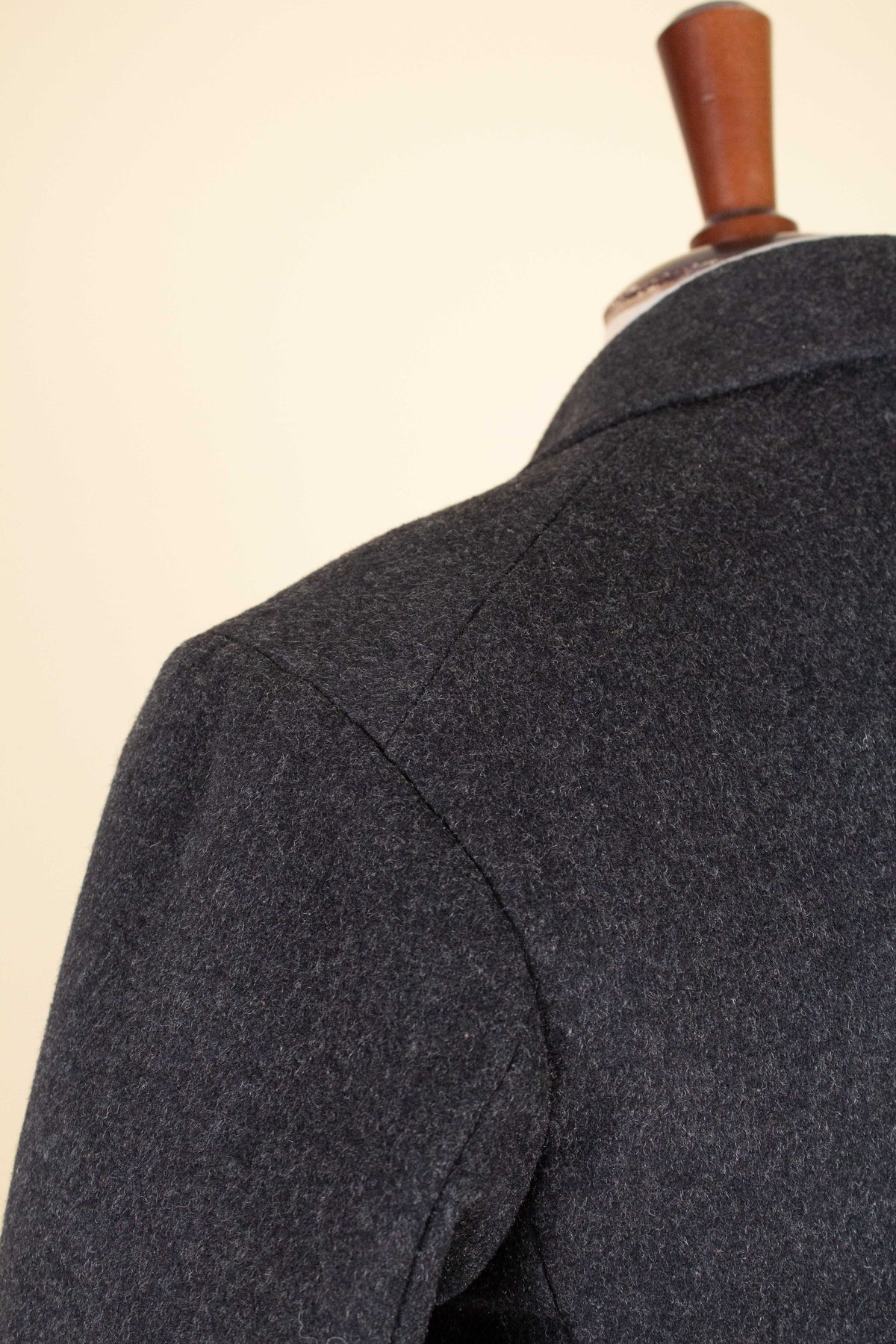 The jacket is double-breasted with contrasting brown buttons and features three rows of buttons, all of which are functional. It has horizontal front pockets with flaps as well as a breast pocket. The back is straight and lacks vents. The sleeves feature two buttons at the cuffs. Internally, the jacket is fully lined in a grey-mottled wool fabric throughout the body and includes an inner pocket on the right-hand side.