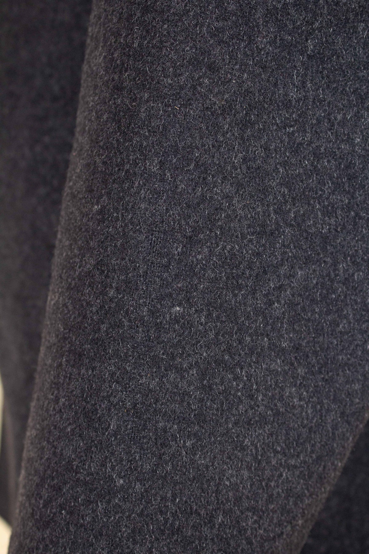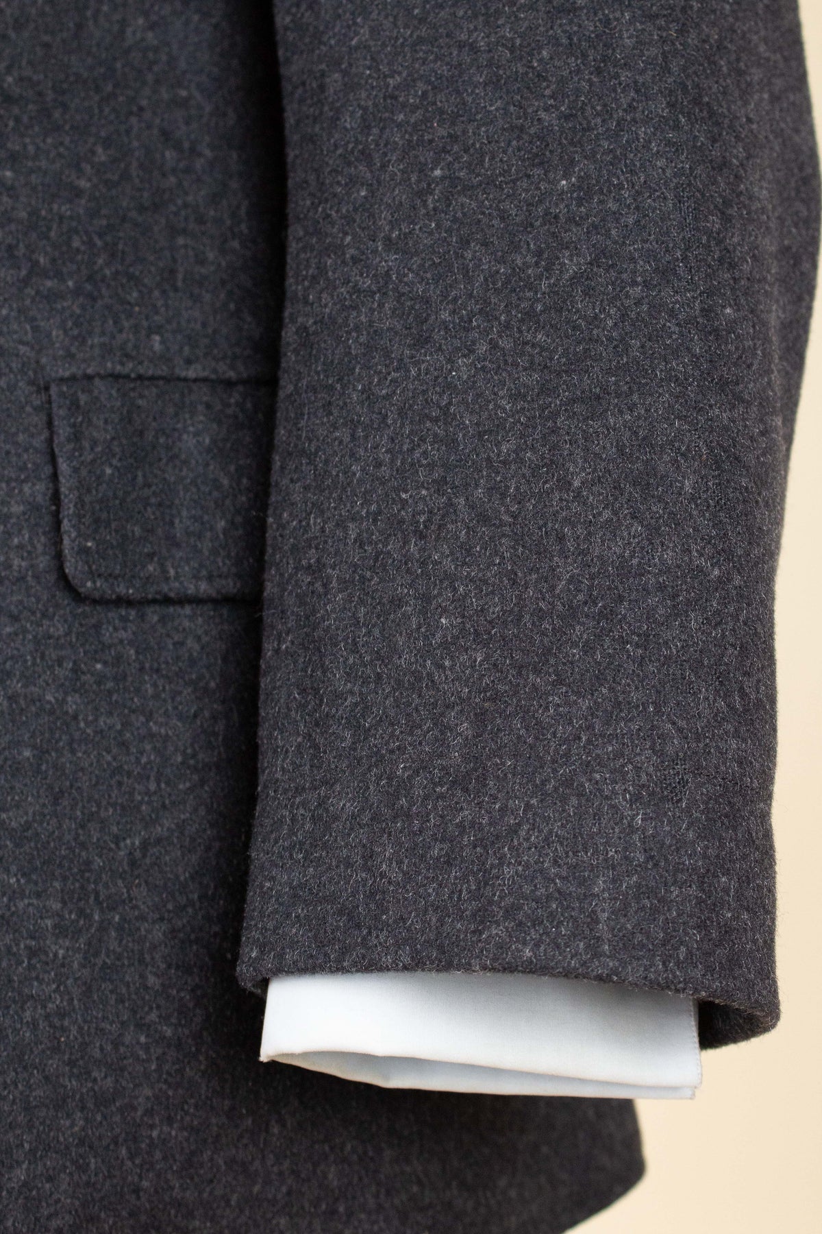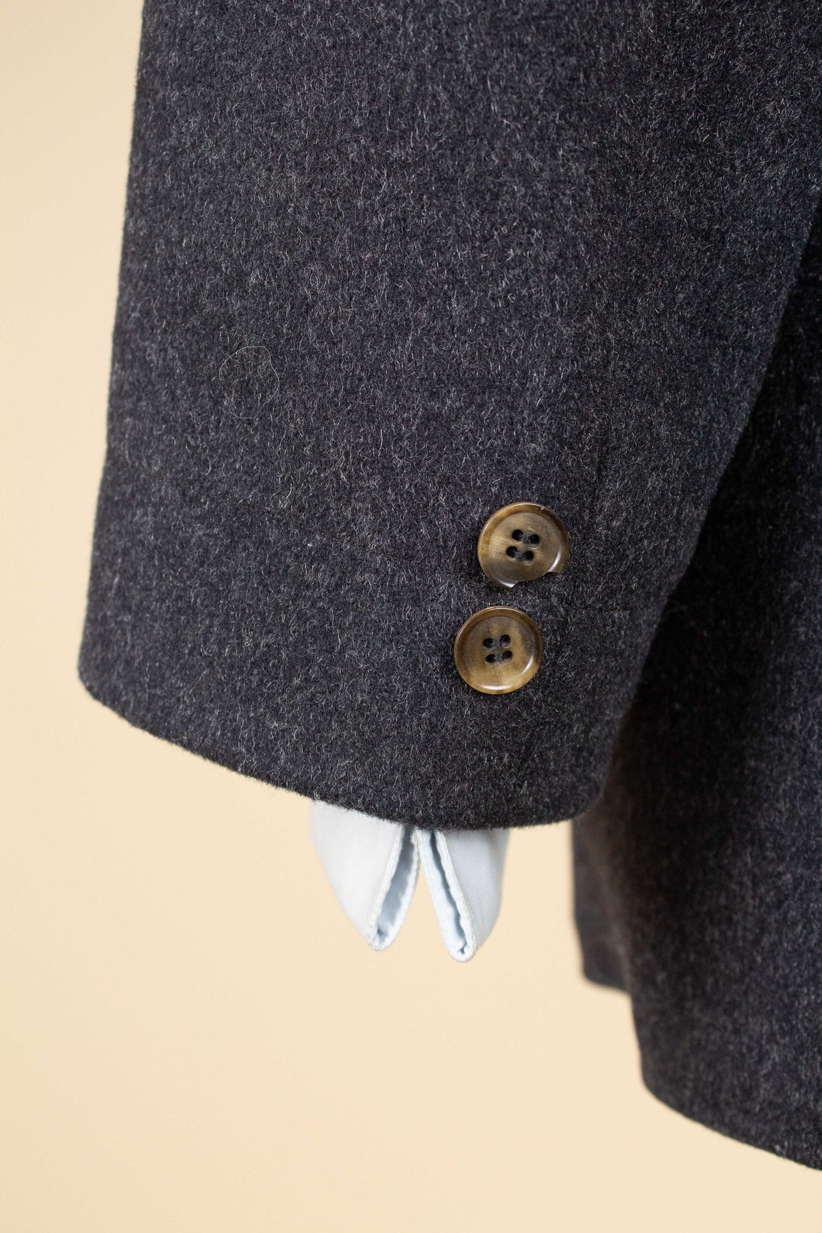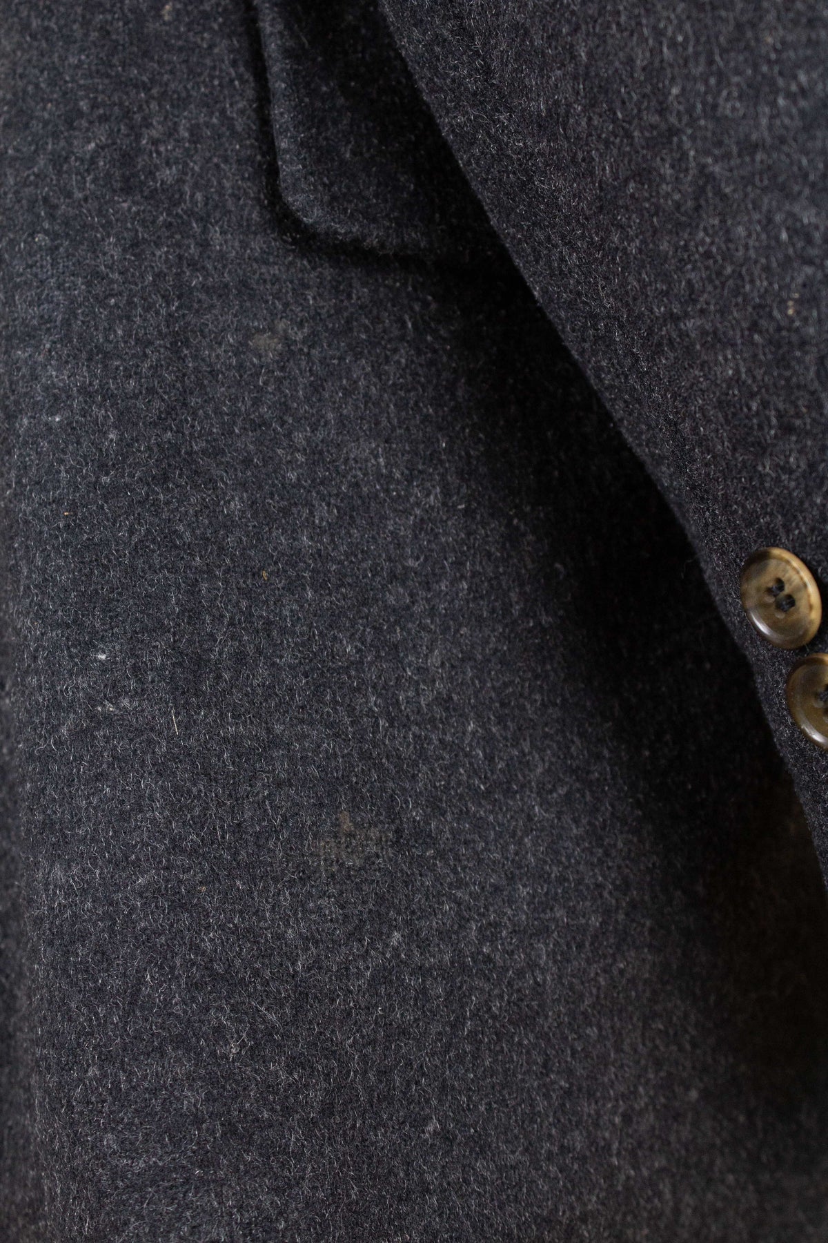 The jacket is double-breasted with contrasting brown buttons and features three rows of buttons, all of which are functional. It has horizontal front pockets with flaps as well as a breast pocket. The back is straight and lacks vents. The sleeves feature two buttons at the cuffs. Internally, the jacket is fully lined in a grey-mottled wool fabric throughout the body and includes an inner pocket on the right-hand side.