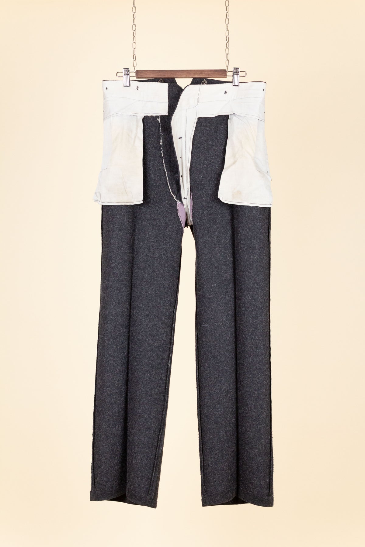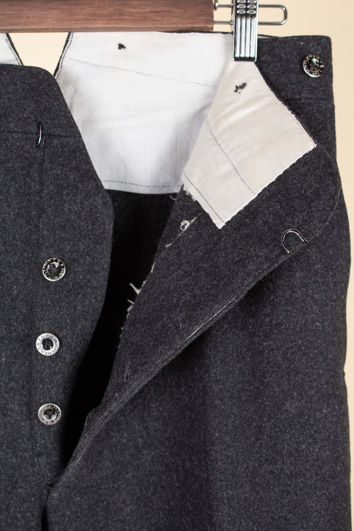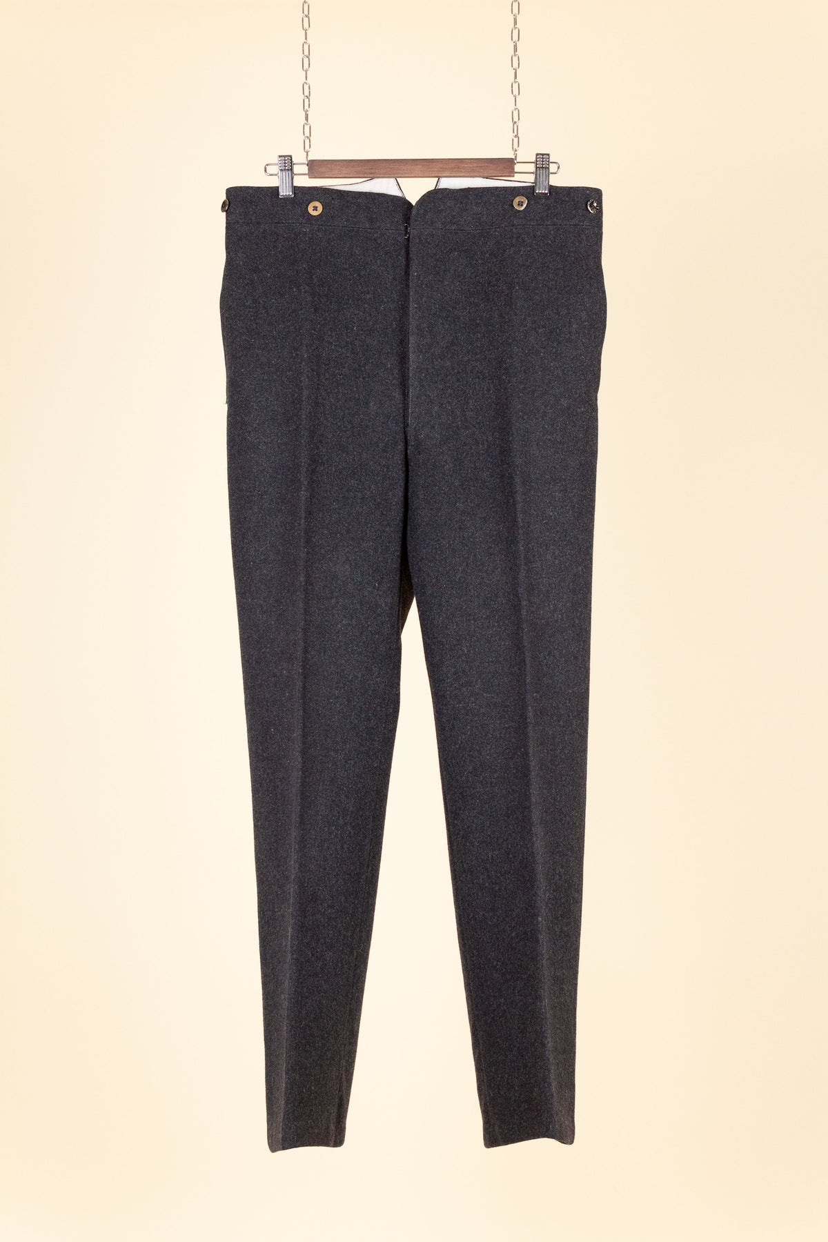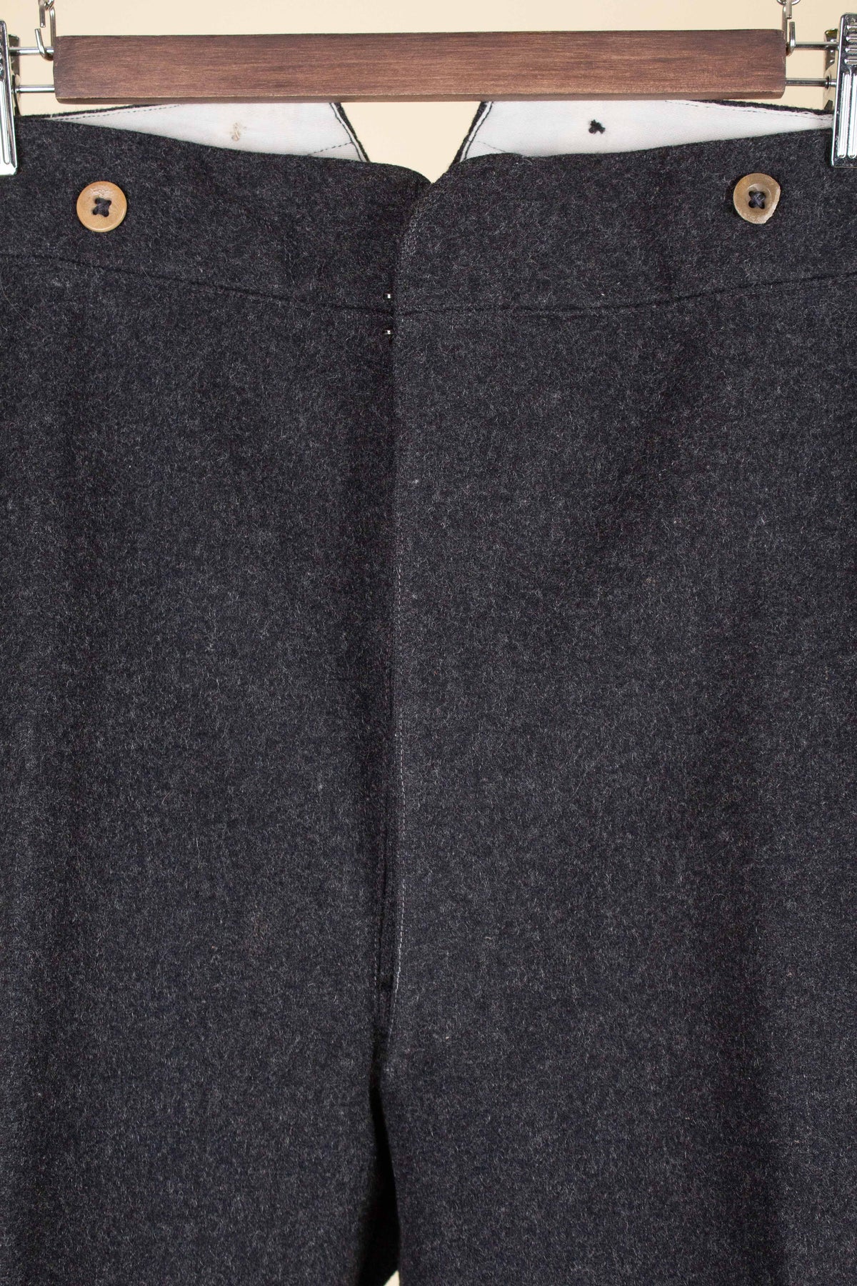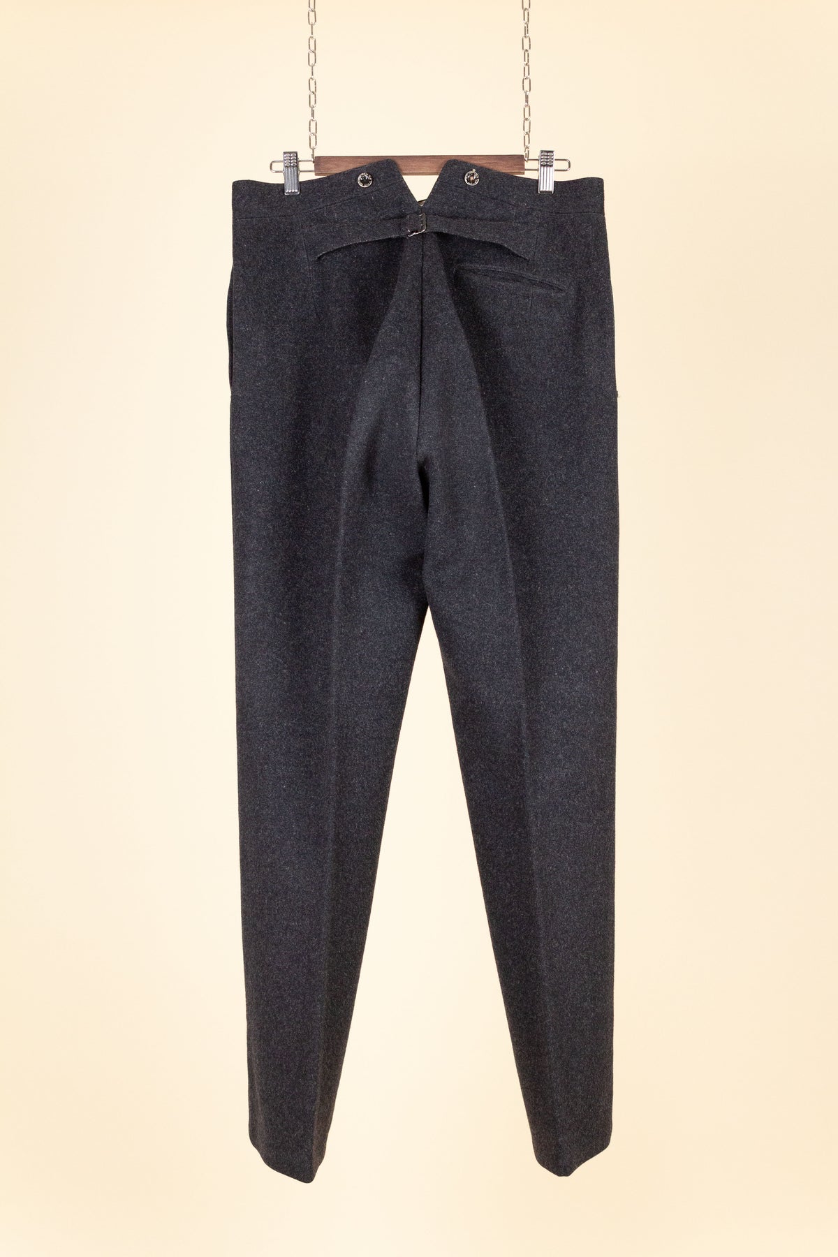 The trousers are flat-fronted, with no pleats. They feature vertical front pockets and external buttons on the waistband for braces, which is typical of the period. They have a button fly and no turn-ups at the hems. Turning them over reveals several characteristic details of the era: they feature a so-called fishtail back, meaning the centre seam is split up towards the waistband, and they also include a back strap for size adjustment.