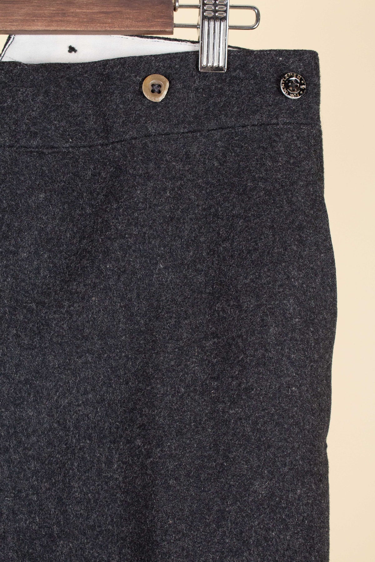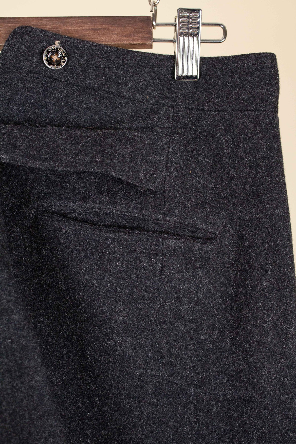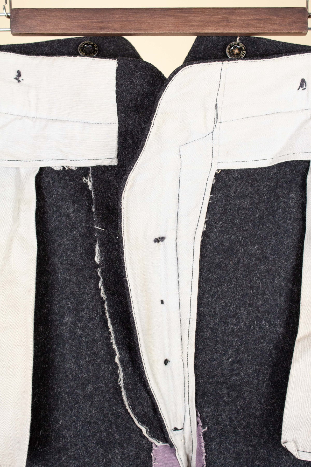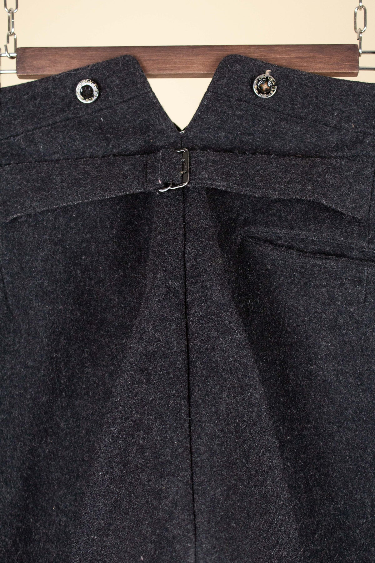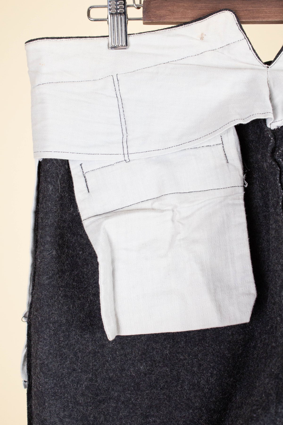 The trousers are flat-fronted, with no pleats. They feature vertical front pockets and external buttons on the waistband for braces, which is typical of the period. They have a button fly and no turn-ups at the hems. Turning them over reveals several characteristic details of the era: they feature a so-called fishtail back, meaning the centre seam is split up towards the waistband, and they also include a back strap for size adjustment.