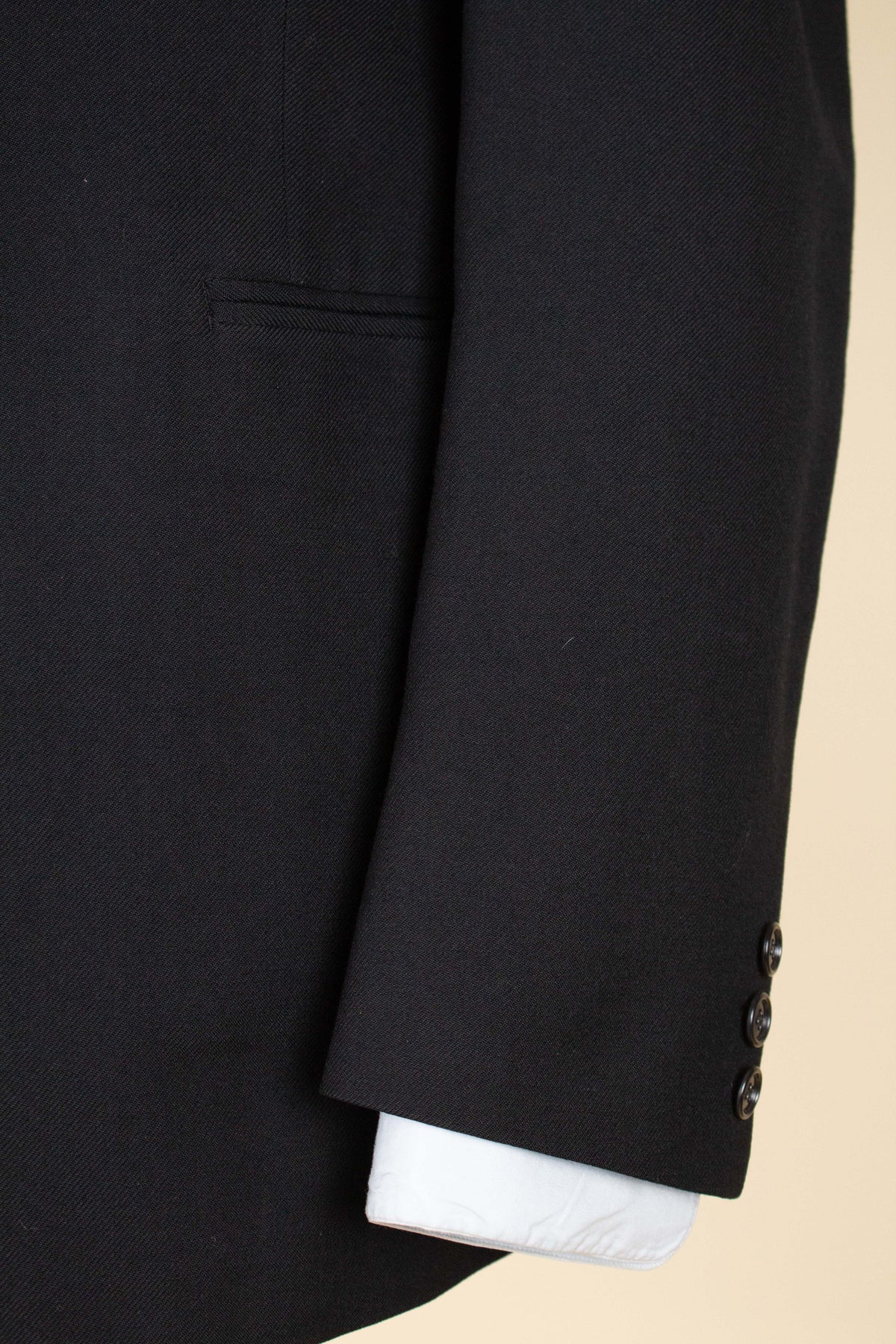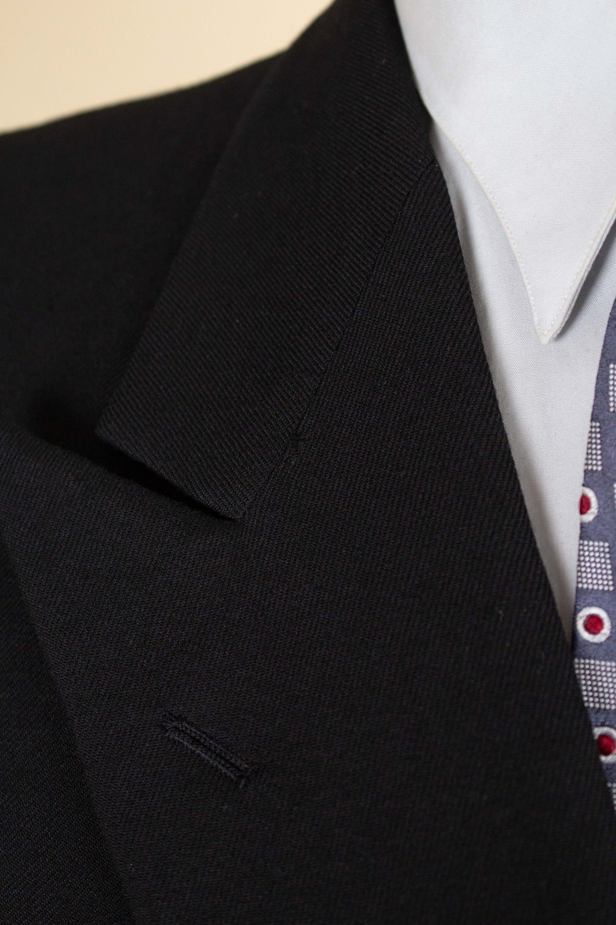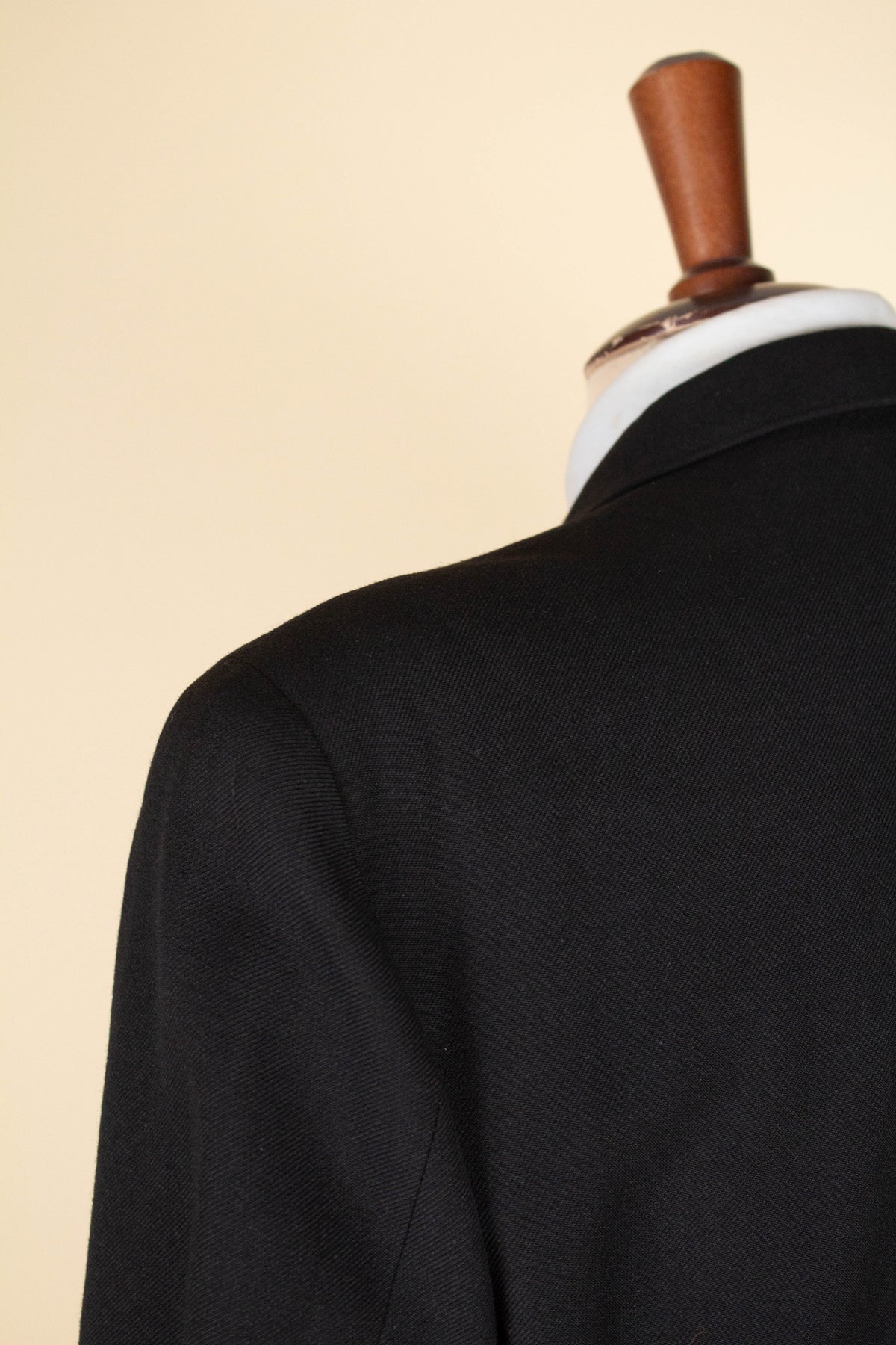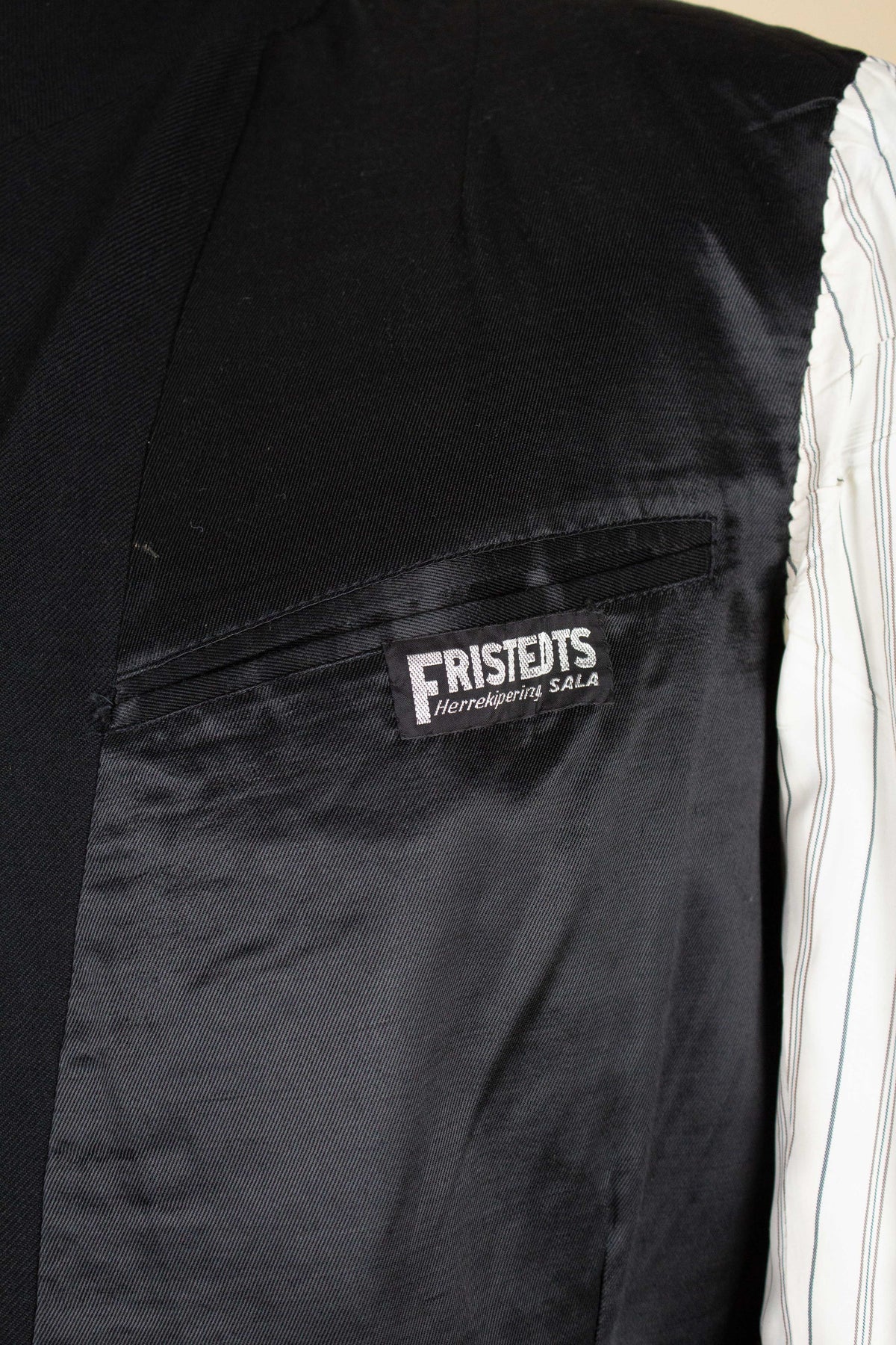 This suit is of Swedish origin and was originally sold sometime during the 1940s at the menswear store Fristedts in Sala, a small town just outside Stockholm. It is tailored from a black wool fabric with a subtle twill texture.