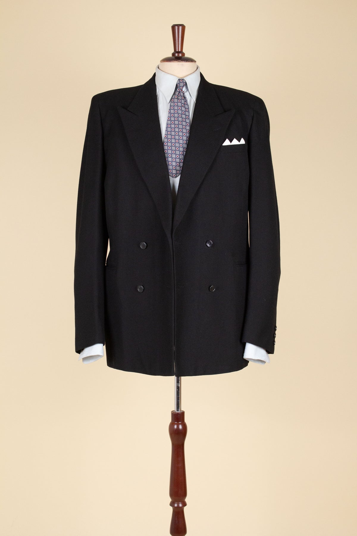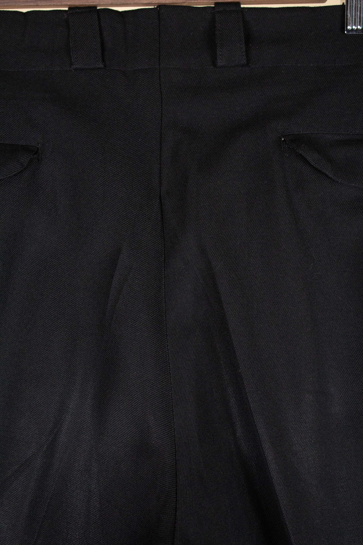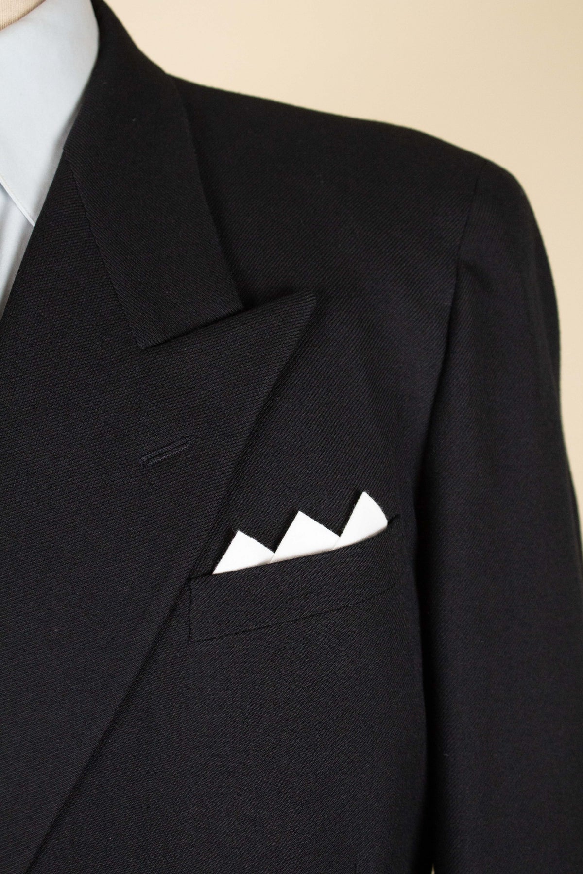 This suit is of Swedish origin and was originally sold sometime during the 1940s at the menswear store Fristedts in Sala, a small town just outside Stockholm. It is tailored from a black wool fabric with a subtle twill texture.