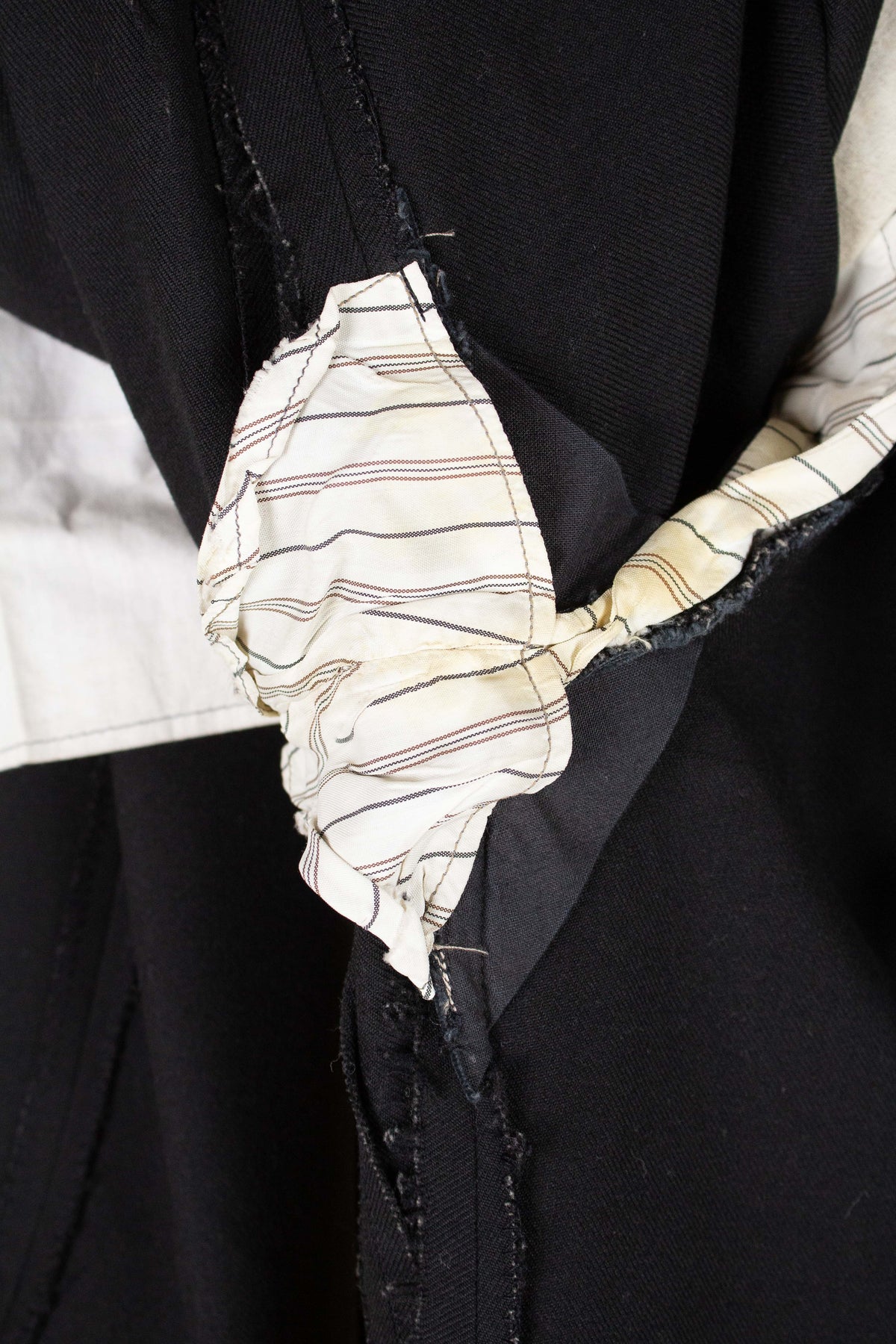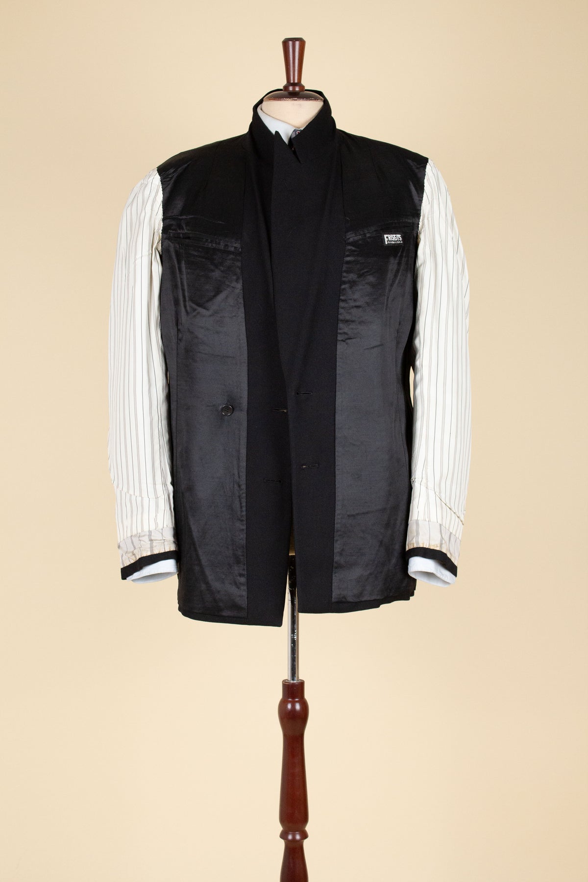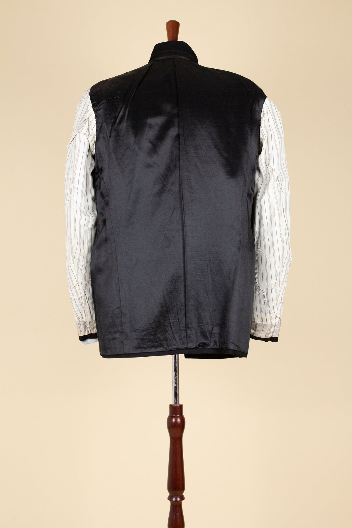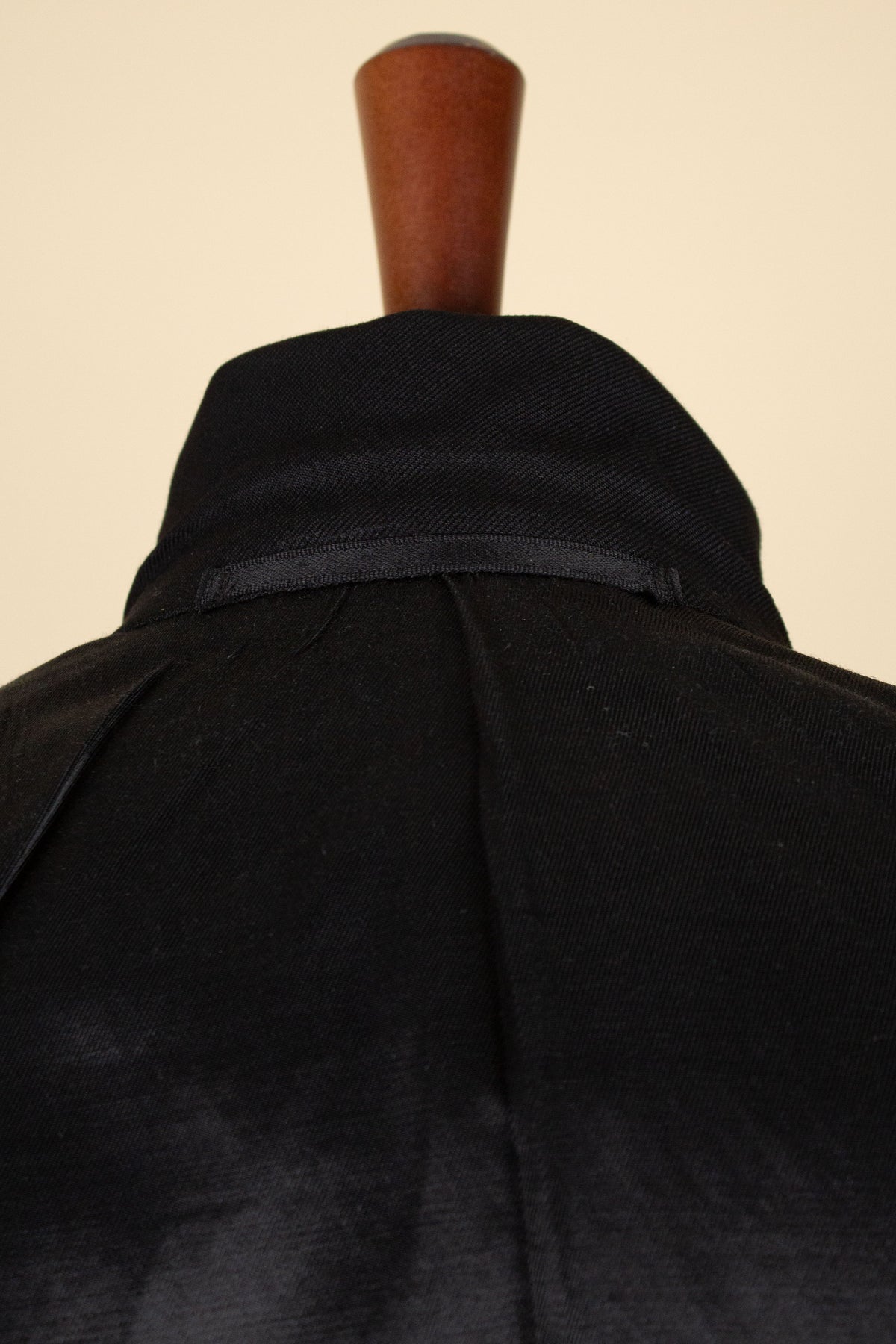 This suit is of Swedish origin and was originally sold sometime during the 1940s at the menswear store Fristedts in Sala, a small town just outside Stockholm. It is tailored from a black wool fabric with a subtle twill texture.