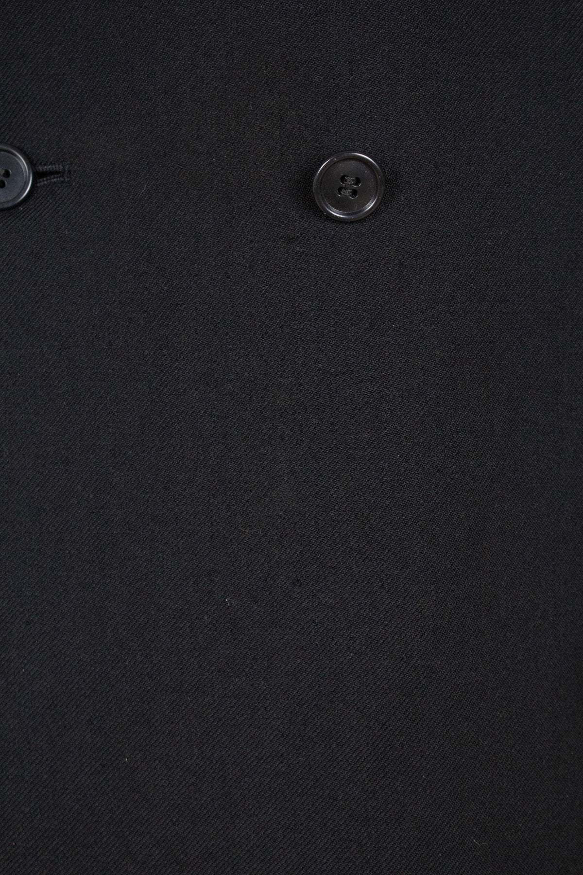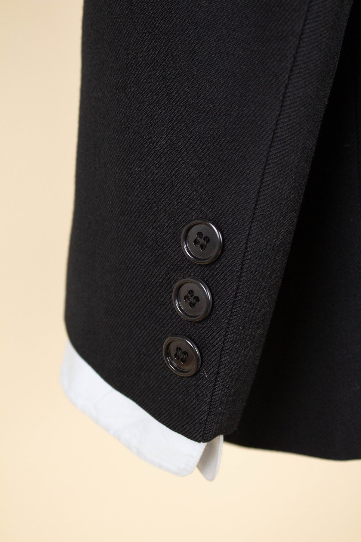 The jacket is double-breasted with two low-set button rows. It features horizontal jetted front pockets and a breast pocket. The cuffs are finished with three buttons. The left lapel has a buttonhole. The back is straight and closed, with no vent. Internally, it is fully lined and has two inner pockets, one on each side.