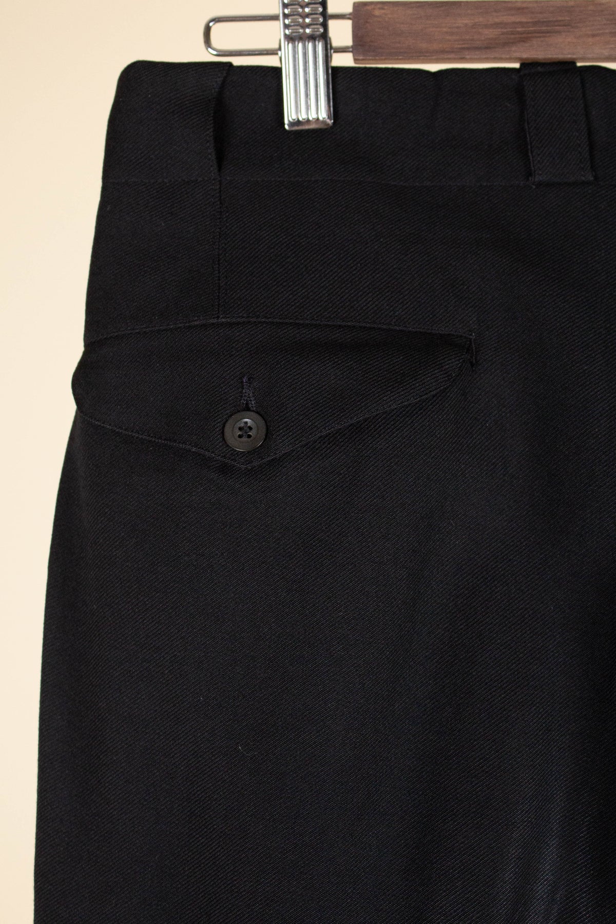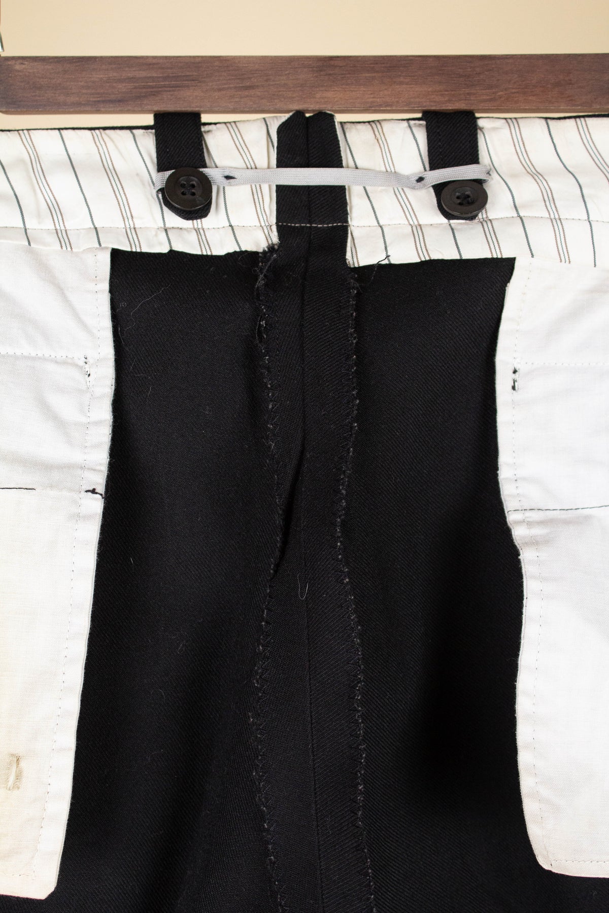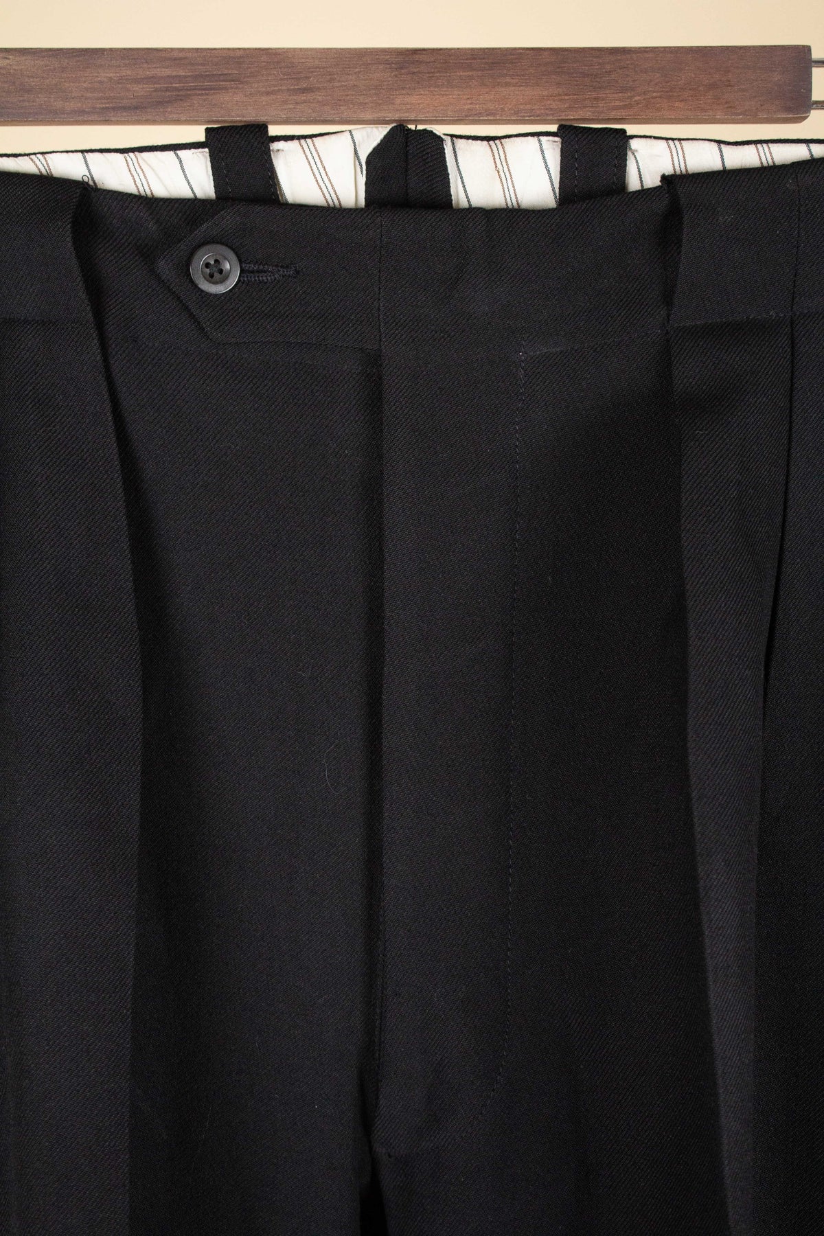 The trousers feature double pleats, slightly slanted front pockets, and a button fly. They have a so-called tunnel loop construction, meaning that any belt will sit partially concealed within a channel running along the waistband. Inside the waistband there are buttons for braces. The hems are finished with turn-ups. At the back, there is one pocket on each side, both with flaps and button fastening.