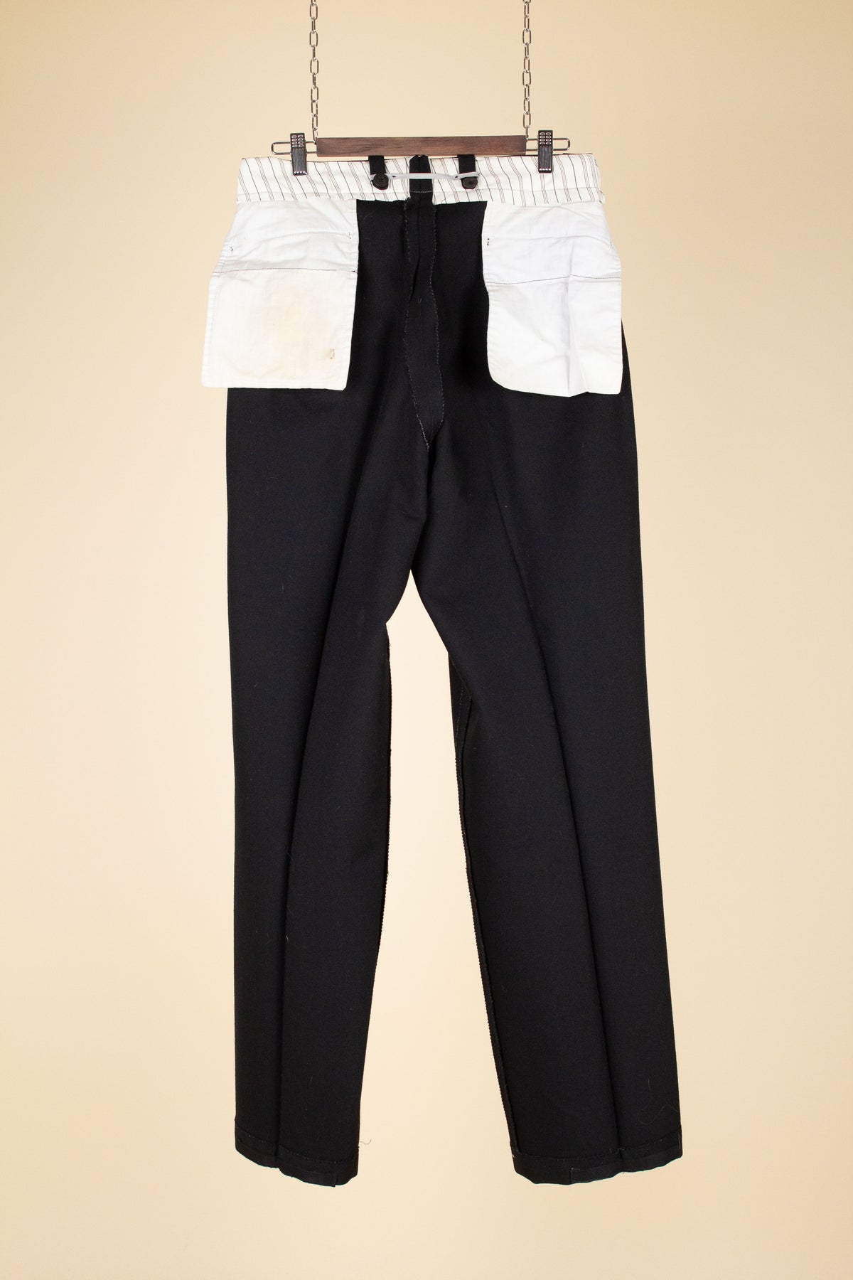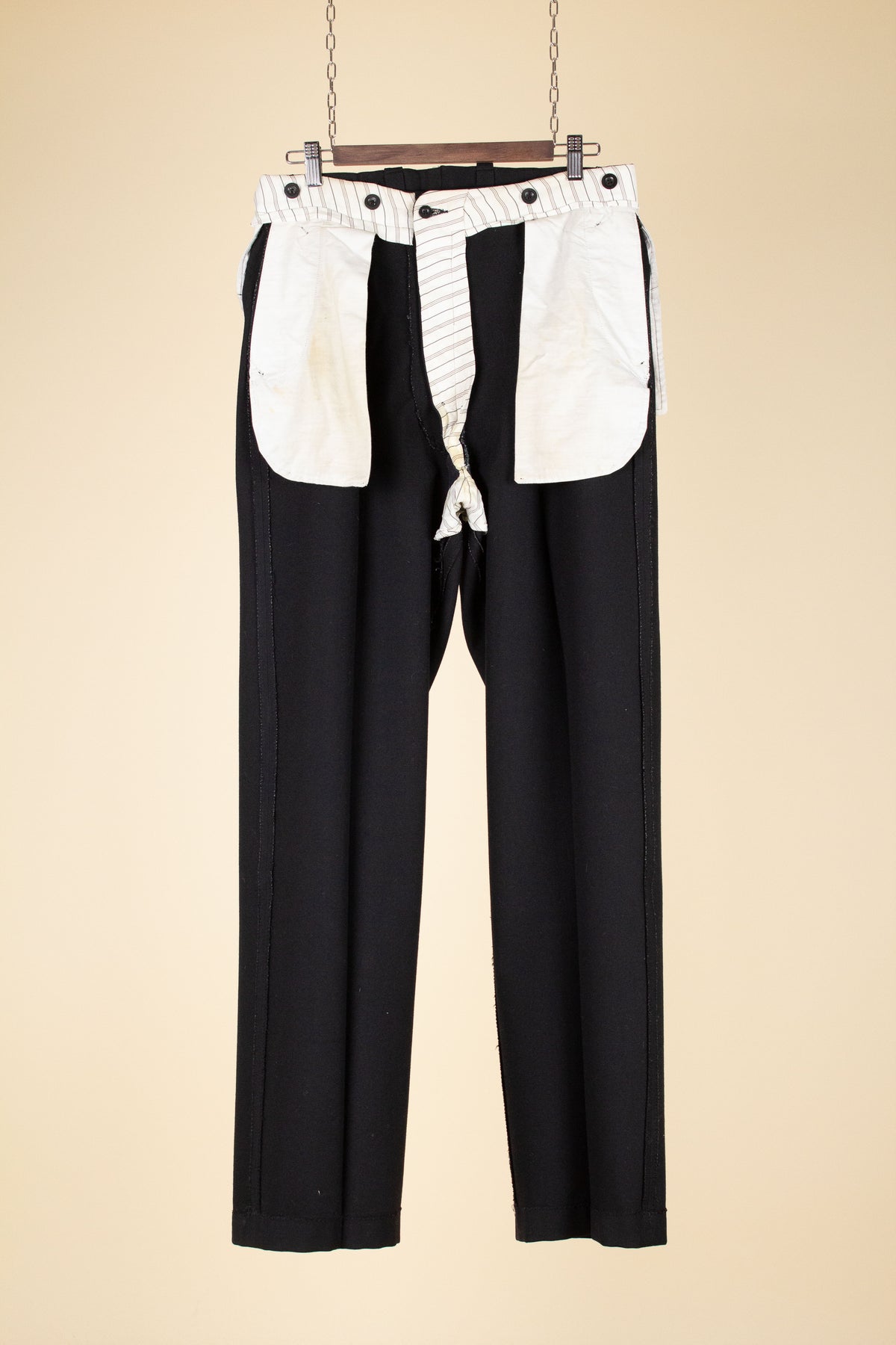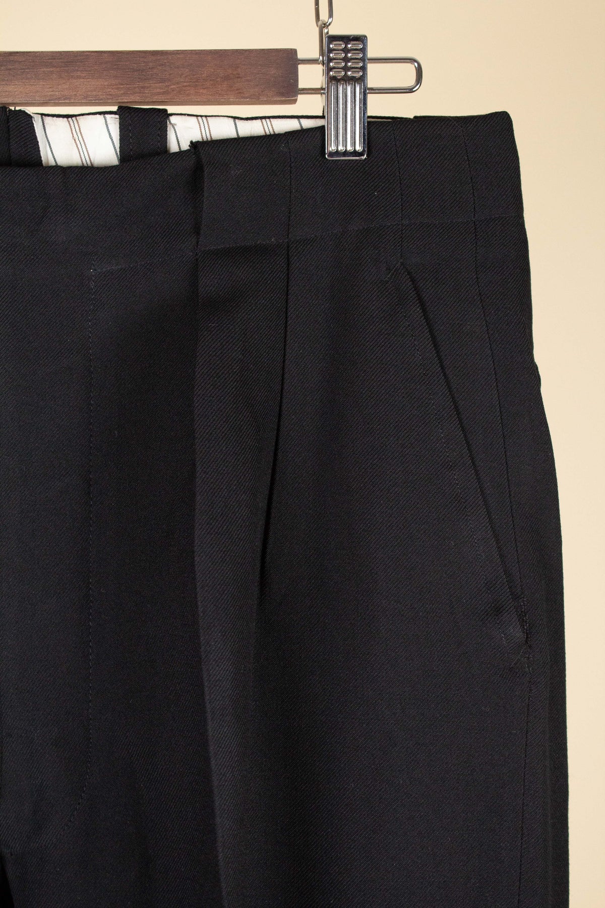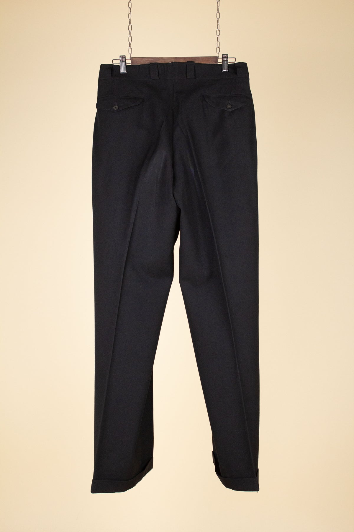 The trousers feature double pleats, slightly slanted front pockets, and a button fly. They have a so-called tunnel loop construction, meaning that any belt will sit partially concealed within a channel running along the waistband. Inside the waistband there are buttons for braces. The hems are finished with turn-ups. At the back, there is one pocket on each side, both with flaps and button fastening.