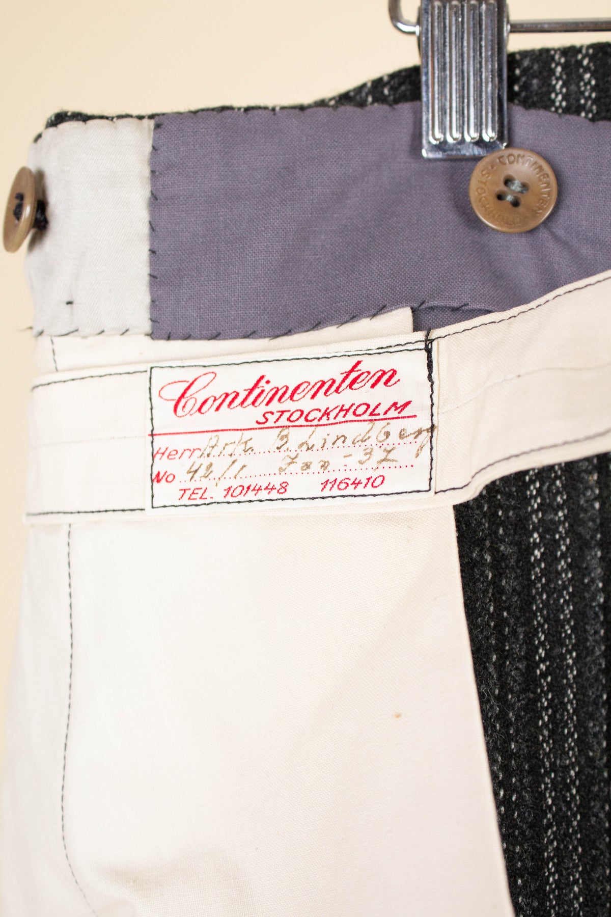 These trousers are of Swedish origin, made bespoke in 1937 at Continenten, a tailor based in Stockholm. They are intended to be worn with a morning jacket and waistcoat, and feature a traditional striped pattern. They are made from a heavy wool fabric. They are designed with a high waist, flat front, and the buttons for braces are placed on the inside of the waistband. They have vertical front pockets and a button fly. At the back, they have a fishtail and an adjustable buckle for waist size. There are also two back pockets with piping, one on each side. They lack cuffs. All of these details are typically seen in trousers from even earlier, before the 1920s. However, traditional formal trousers continued to be made in this style for a long time, despite changes in the "general" suit trouser fashion.