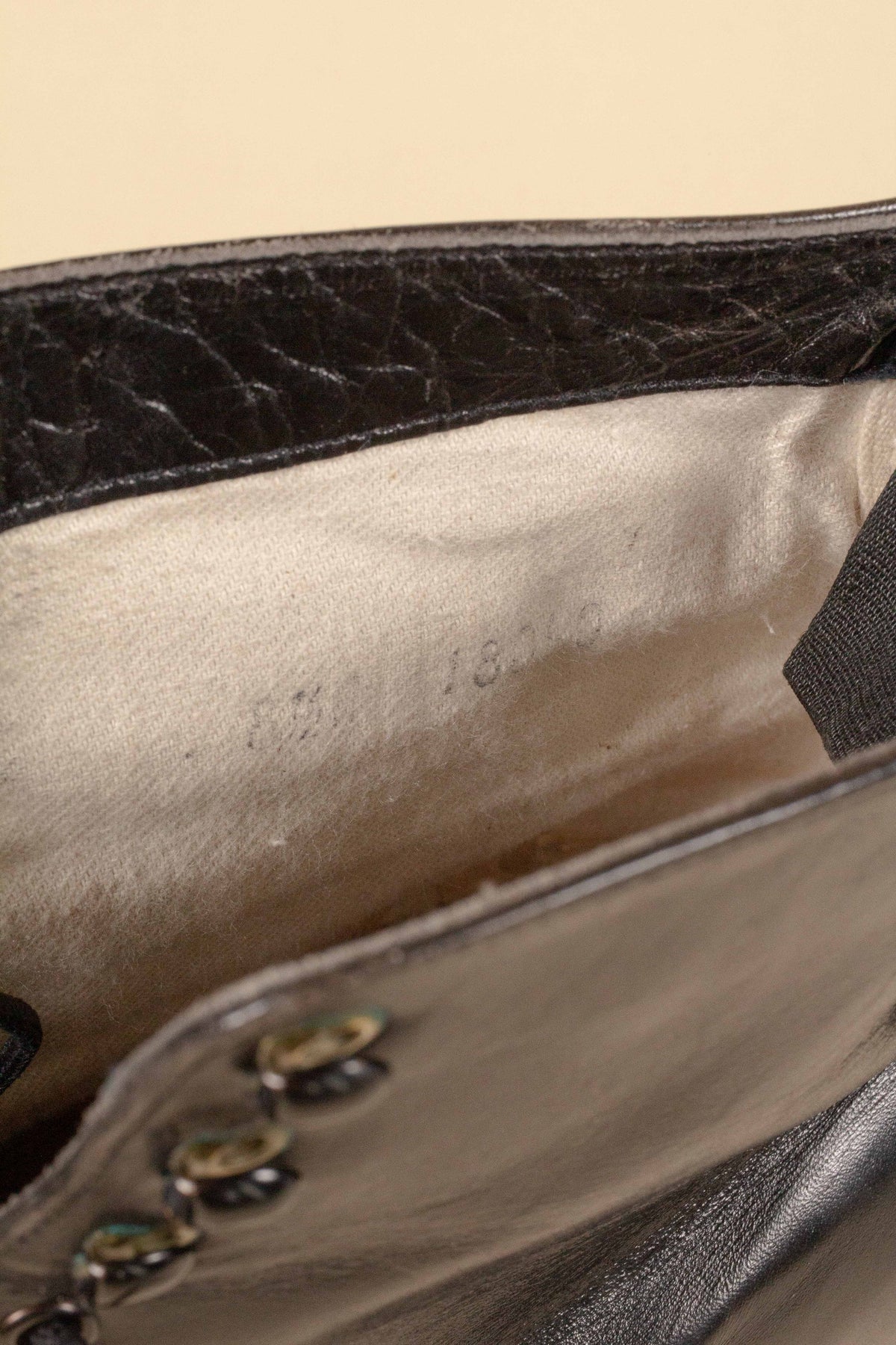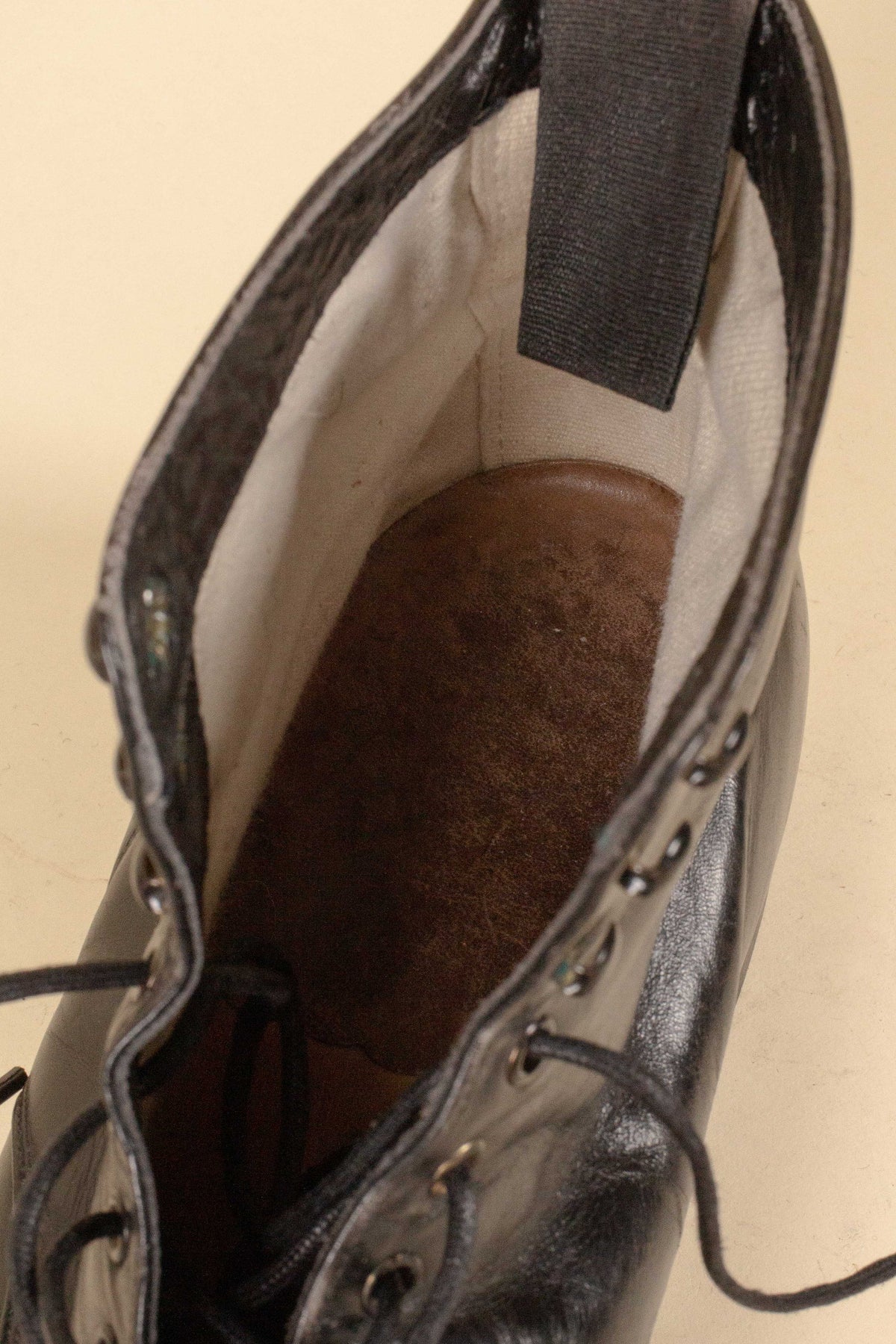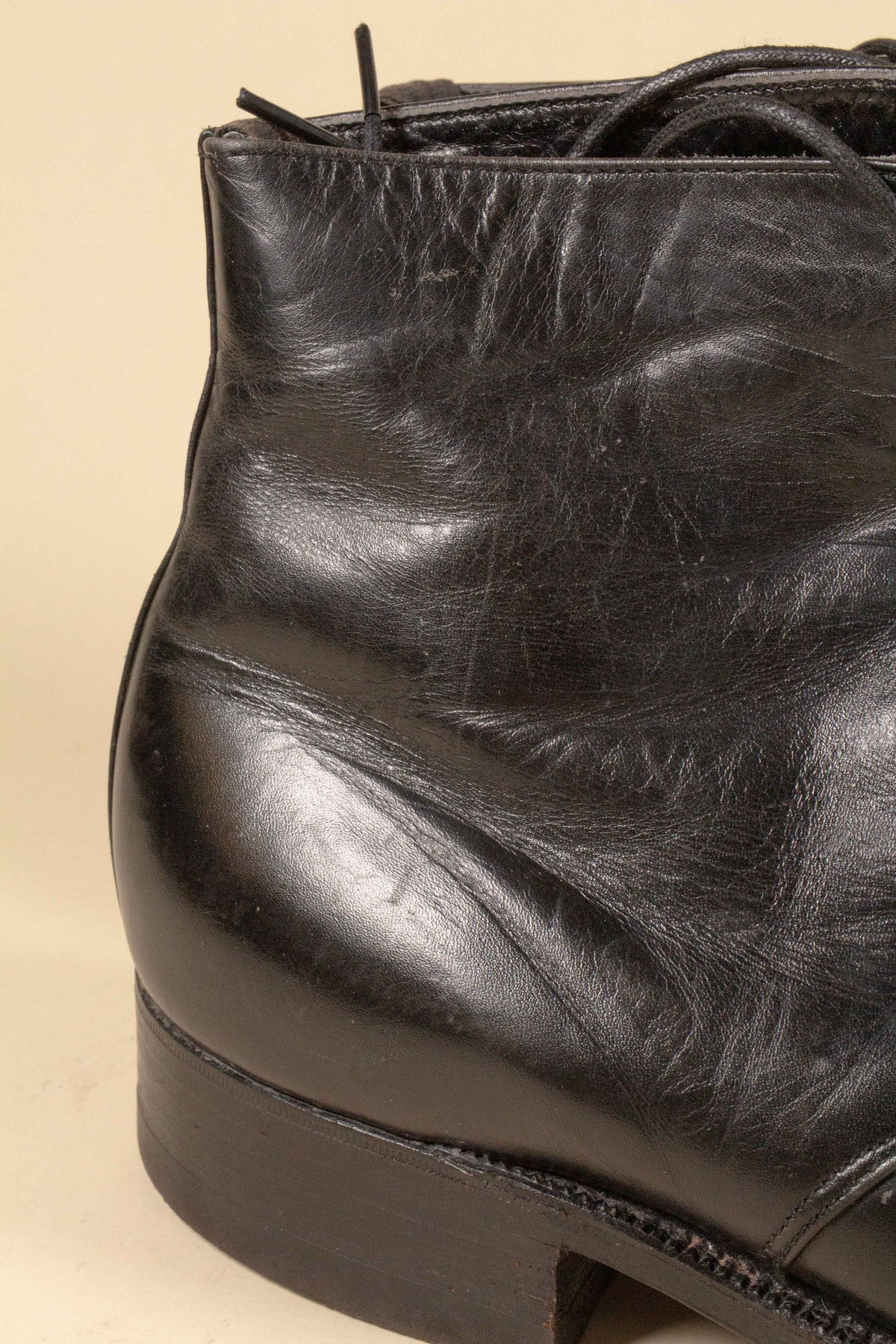 These classic black boots are of Swedish origin. They bear no label or logo indicating the maker; however, the markings confirm that they are Swedish. They were most likely produced sometime during the 1940s or 1950s. The interior is lined with a light canvas fabric. They feature leather soles and rubber heels, the latter also Swedish-made by Tretorn.