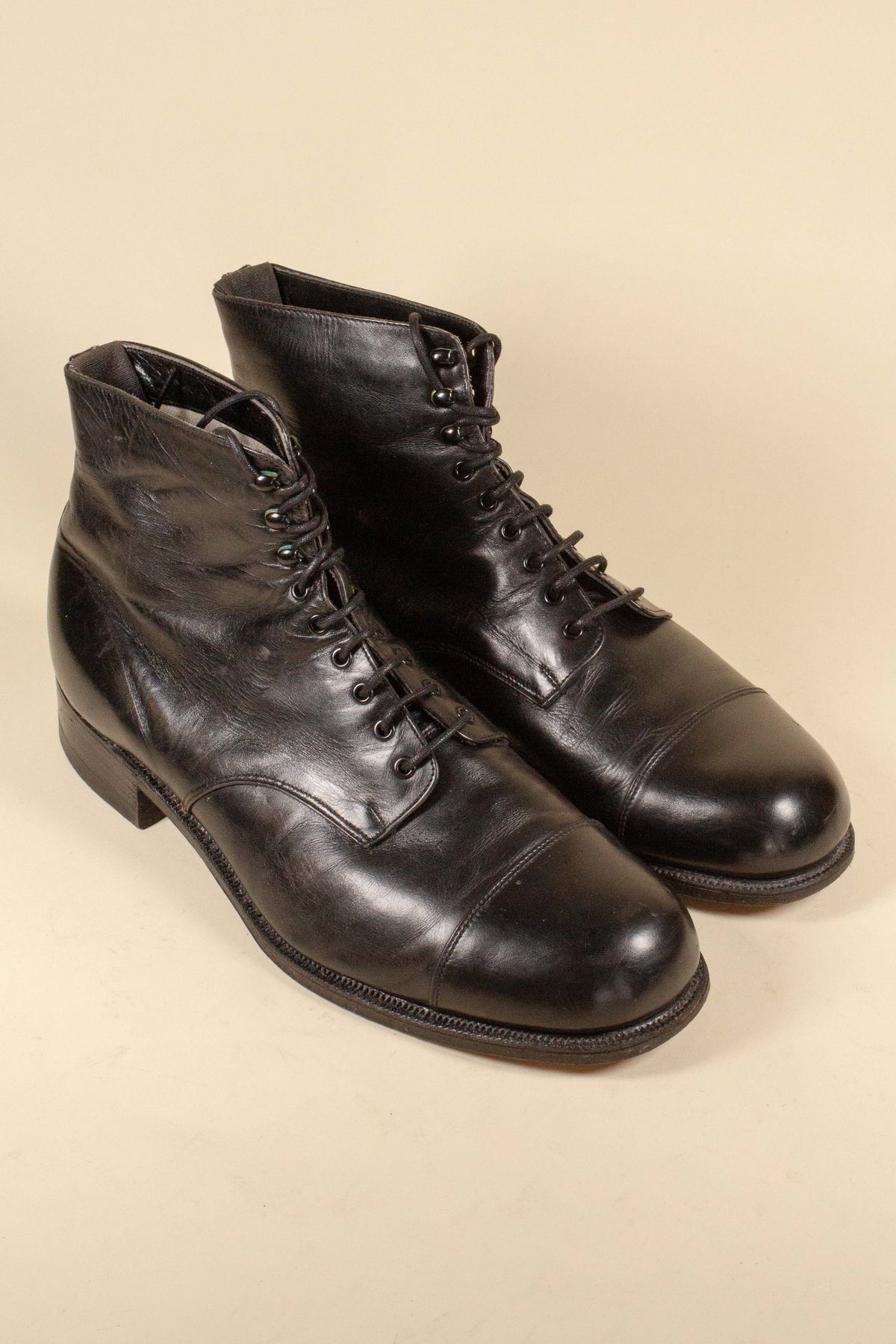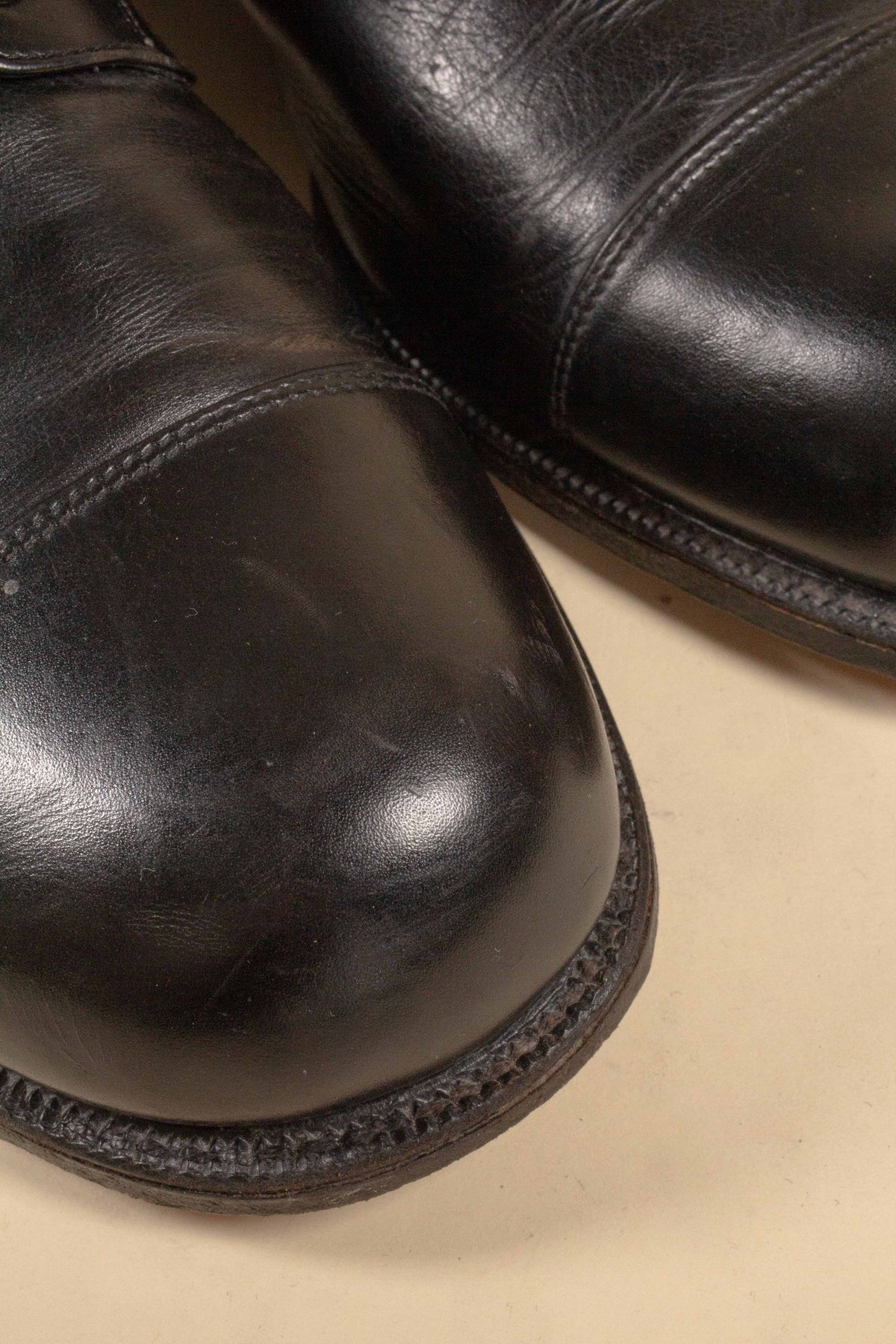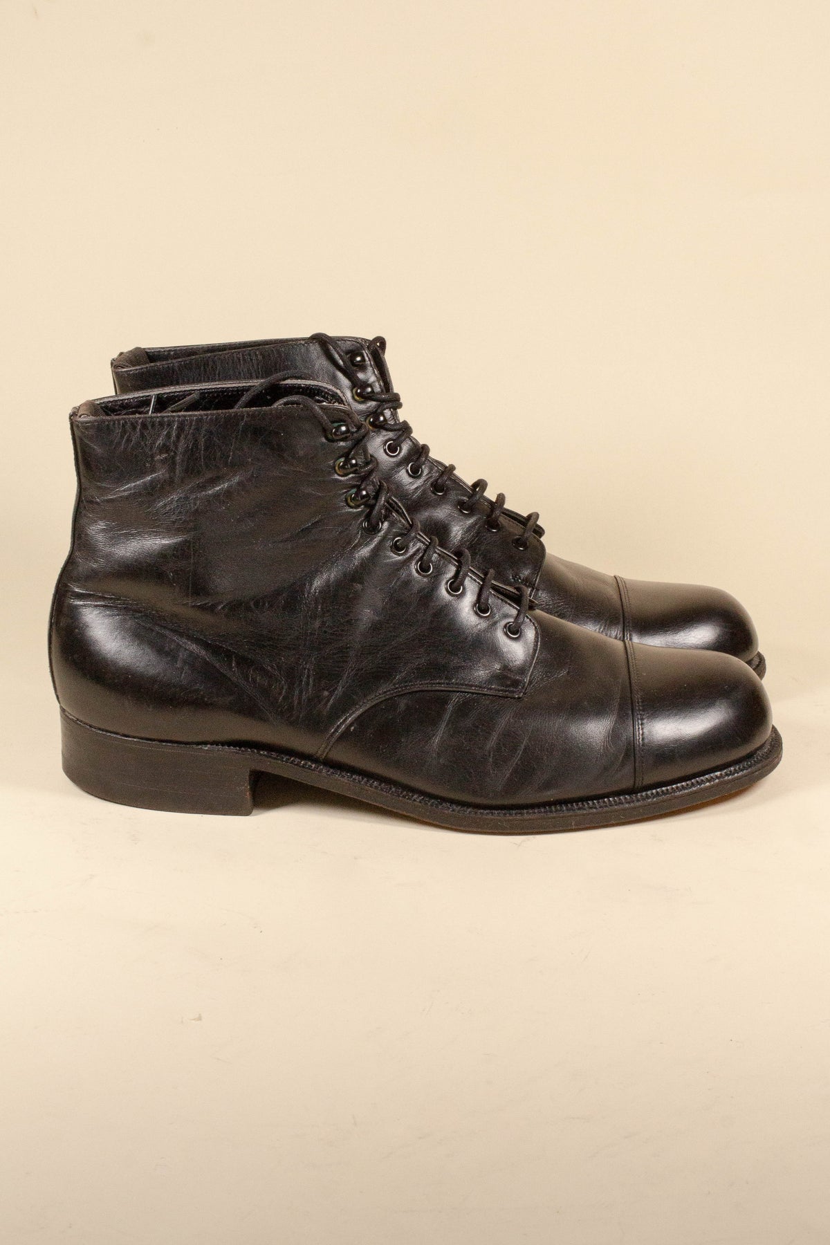 These classic black boots are of Swedish origin. They bear no label or logo indicating the maker; however, the markings confirm that they are Swedish. They were most likely produced sometime during the 1940s or 1950s. The interior is lined with a light canvas fabric. They feature leather soles and rubber heels, the latter also Swedish-made by Tretorn.