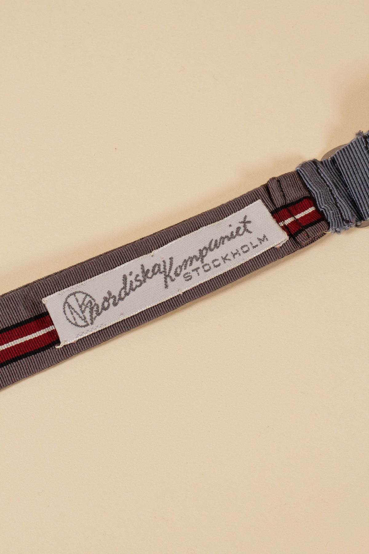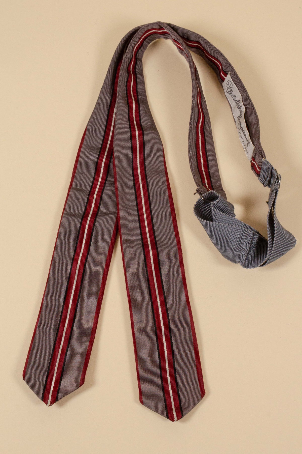 This bow tie is of Swedish origin and was sold at the NK department store in Stockholm sometime during the 1940s or 1950s. In colour, it is predominantly grey, with a red, blue and white stripe running through the centre. The condition is perfect, with no signs of wear. Please study the photographs carefully and form your own assessment of the condition.