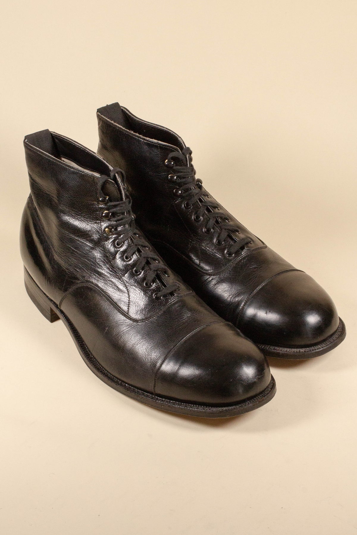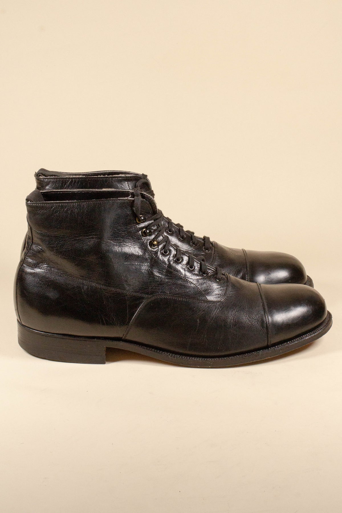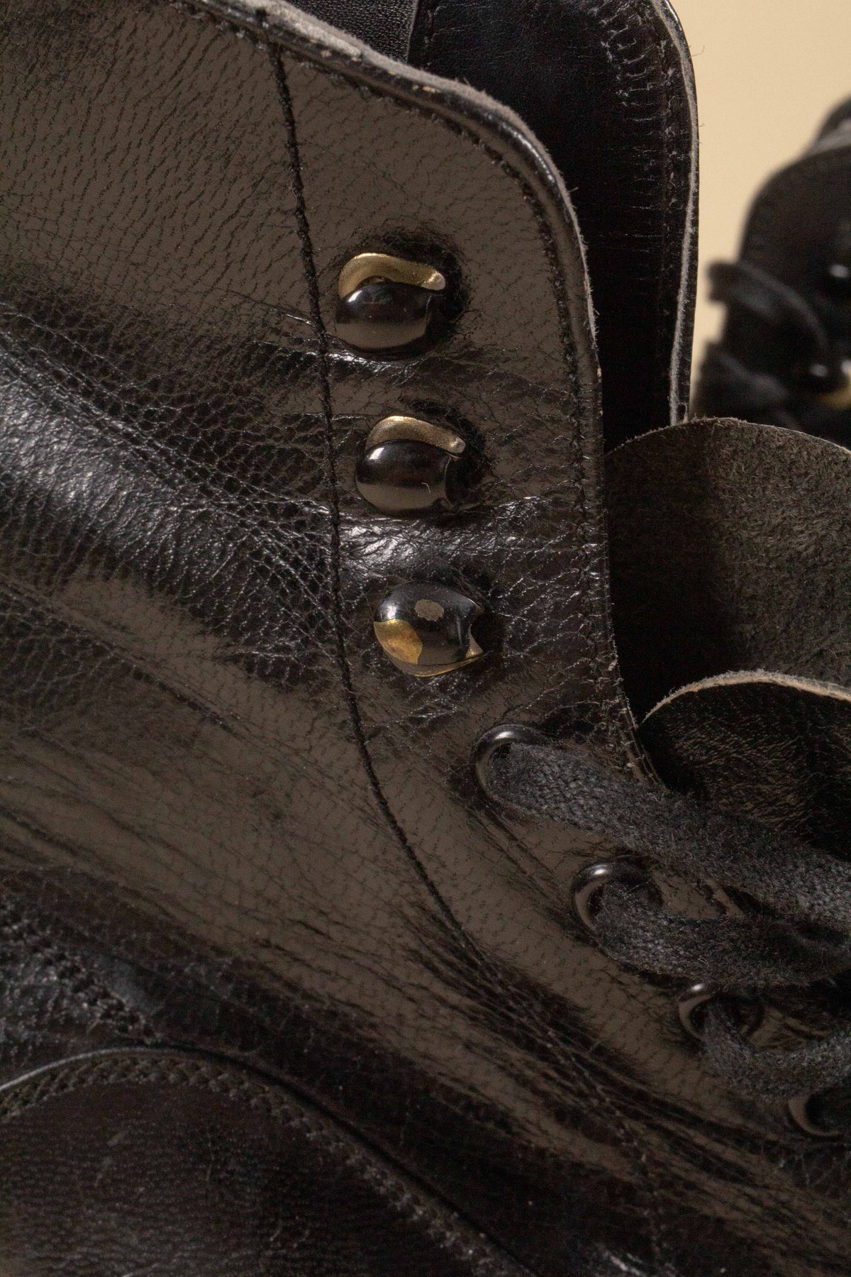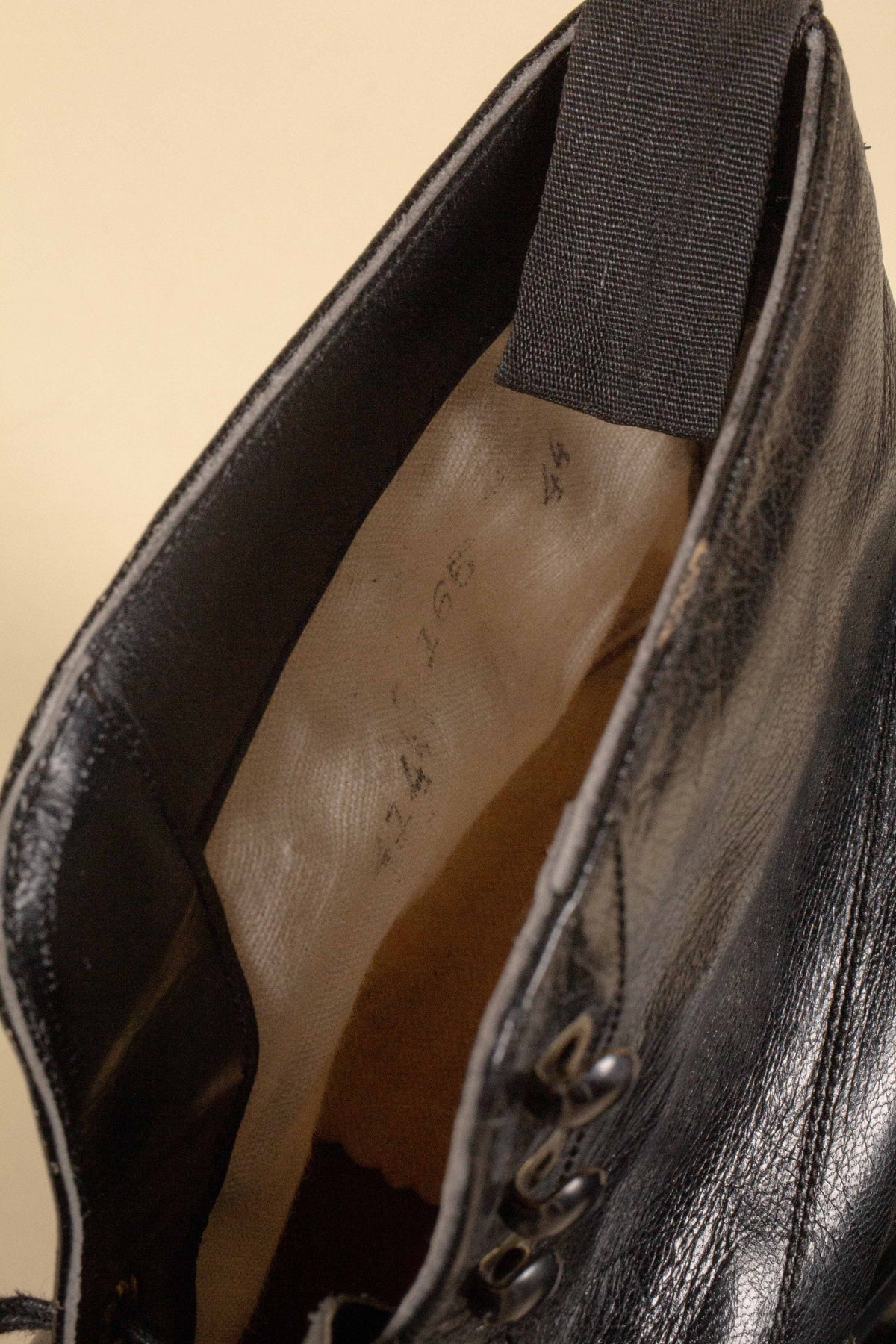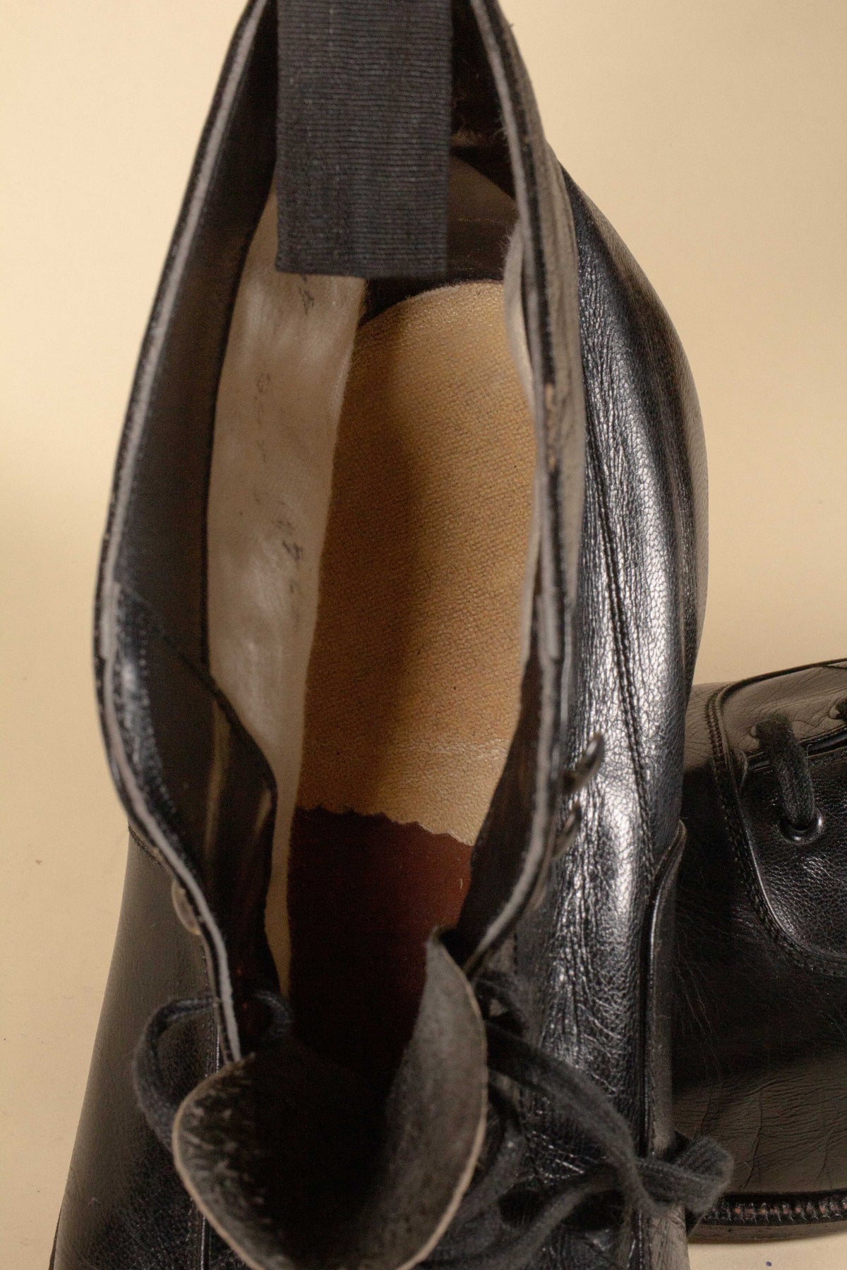 These boots are unbranded, so it is not possible to determine the exact manufacturer. However, a number of conclusions can still be drawn from their construction. They were most likely made during the 1930s. They are crafted from black goatskin, the type of leather that was dominant for Swedish boots at the time. The interior is lined with light-coloured canvas, also typical of Swedish footwear from the first half of the 20th century. They feature leather soles and are Goodyear welted.