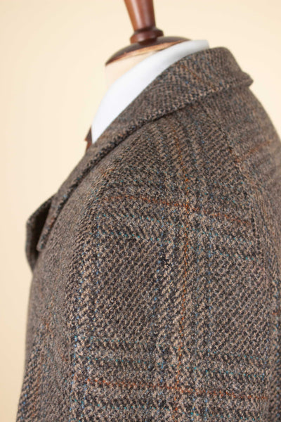 This raglan overcoat dates back to the 1960s and is of Swedish origin. It was produced by Gulins with Scottish tweed fabric from Ballantyne. It is brown with a large overcheck. The coat has a three button single breasted closure and vertical front pockets. It has one vent. It is fully lined and has two inner pockets, one one each side. The overall condition is good, there are no obvious signs of wear except for a repair on the lining. Please have a look at the images and evaluate the condition.